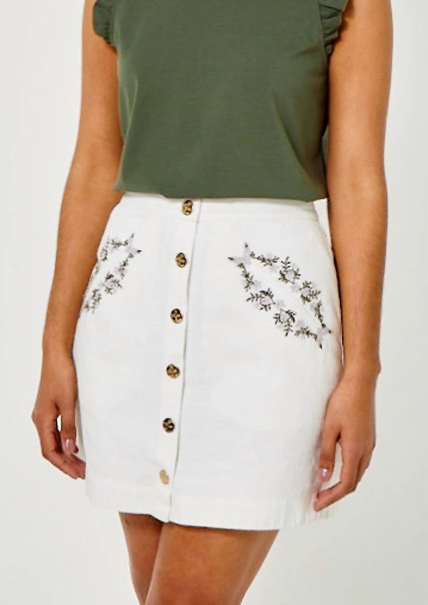 Tuck in your favorite tee for a more laid-back vibe. Elevate your wardrobe with the Cartolina Nantucket Embroidered Cosette Skirt, a charming mini skirt perfect for spring. Crafted in a textured pattern in classic white, this piece features embroidered flower detailing on the pockets, and a custom gold button closure that completes the sophisticated look. With an a-line shape and back elastic at the waistband, it offers a comfortable and flattering fit. Designed for vacations and inspired by 90s fashion, this skirt effortlessly pairs with both dressy and casual ensembles.