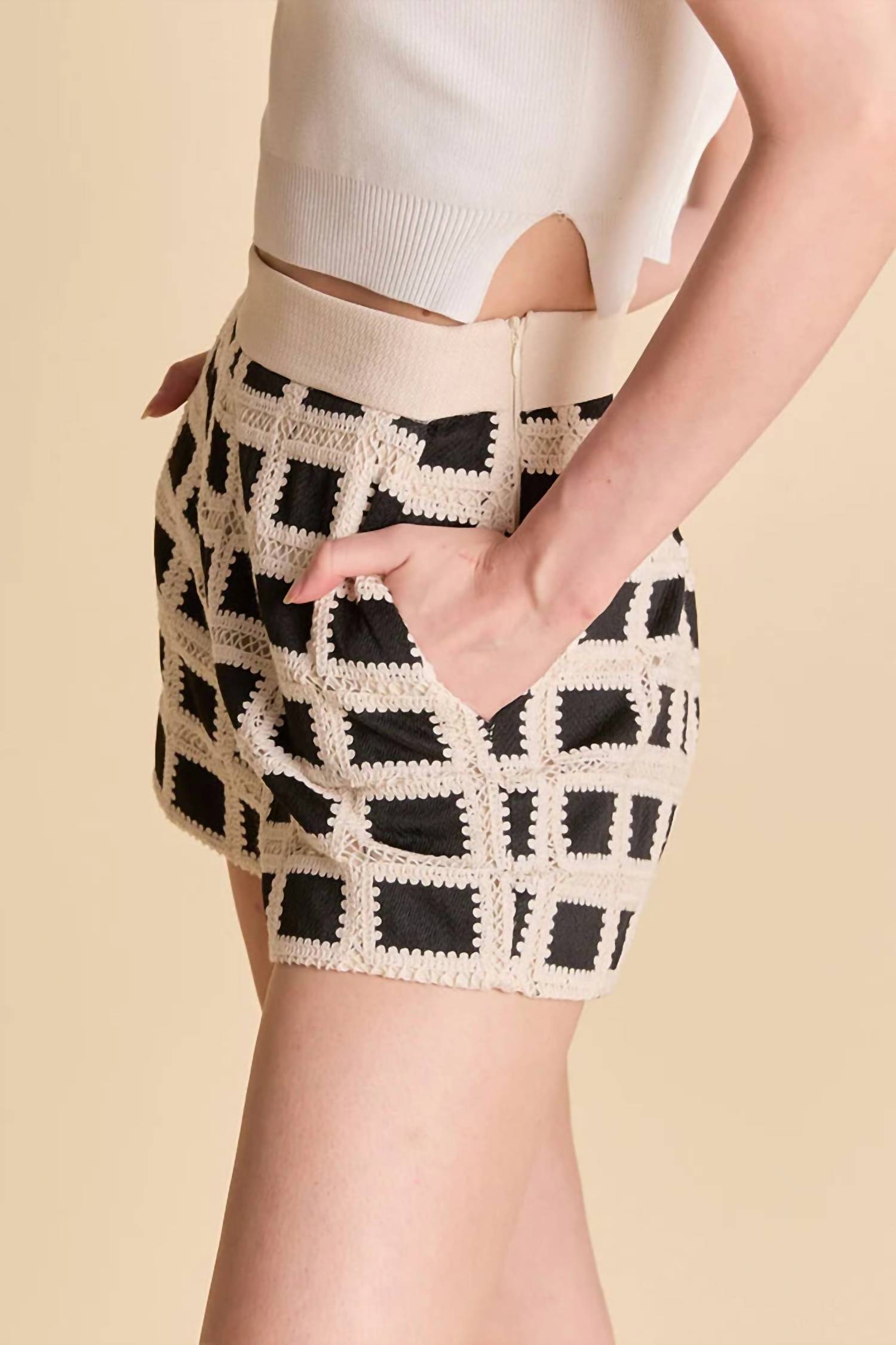 Tuck your favorite tee into these high-waist shorts for a more casual-cool feel. The Bronson High-Waisted Crochet Shorts by English Factory combine playful patchwork crochet with a flattering high-rise fit in a natural and black color scheme. Crafted from 60% Cotton, 40% Polyester, these shorts feature a smocked waistband for comfort and a mini length for a flirty vibe. Practical side pockets and a side invisible zipper closure add functionality. Easy to care for, just machine wash and line dry to maintain the shorts' vibrant look.