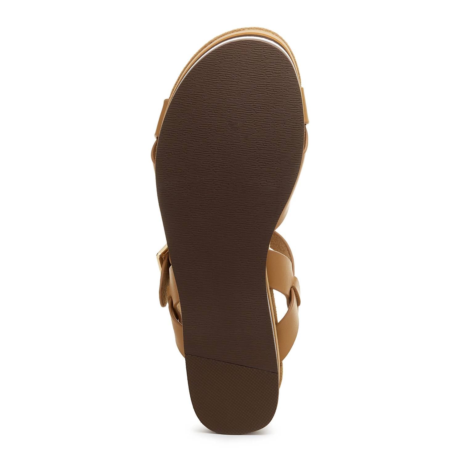 Experience all-day comfort with the Women's Breeze Sandal by KELSI DAGGER, a retro-inspired, color-blocked piece in tan. This sandal boasts interwoven natural leather upper straps, an EVA platform heel with a 1.57-inch height, and a gold KDB buckled ankle strap for style and support. Featuring a well-cushioned microsuede footbed and lining, along with a durable rubber outsole, this sandal is designed for comfort and durability. The open toe and round toe shape enhance its summery vibe, making it an ideal addition to your warm-weather wardrobe.