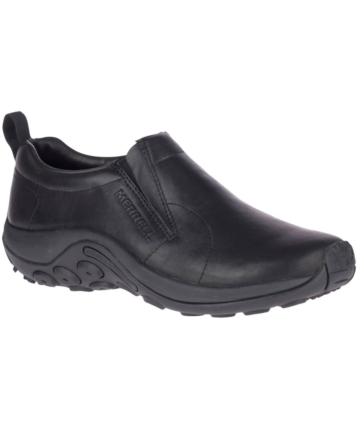 The MERRELL Men's Jungle Moc Leather Two Shoe in monochrome black is perfect for a summer vacation. Designed with a round toe and flat heel, these men's sneakers ensure comfort and trendy style. The leather construction promises durability and an effortlessly chic look. Made for adults, these shoes offer a versatile option that pairs well with a variety of summer outfits.