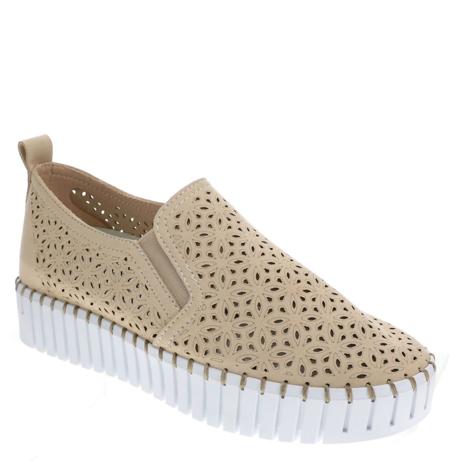 Step out in style with the Women's Slip On Sneaker by Very G, featuring a chic floral notched design. Made from high-quality leather, these tan sneakers sport a round toe and medium width, perfectly blending comfort with trend-forward style. The wedge heel elevates with a 1.5" platform, making this shoe ideal for minimalist travel looks. Perfect for spring outings or Thanksgiving gatherings, pair with your casual ensembles for effortless flair. Consider sizing down by half.
