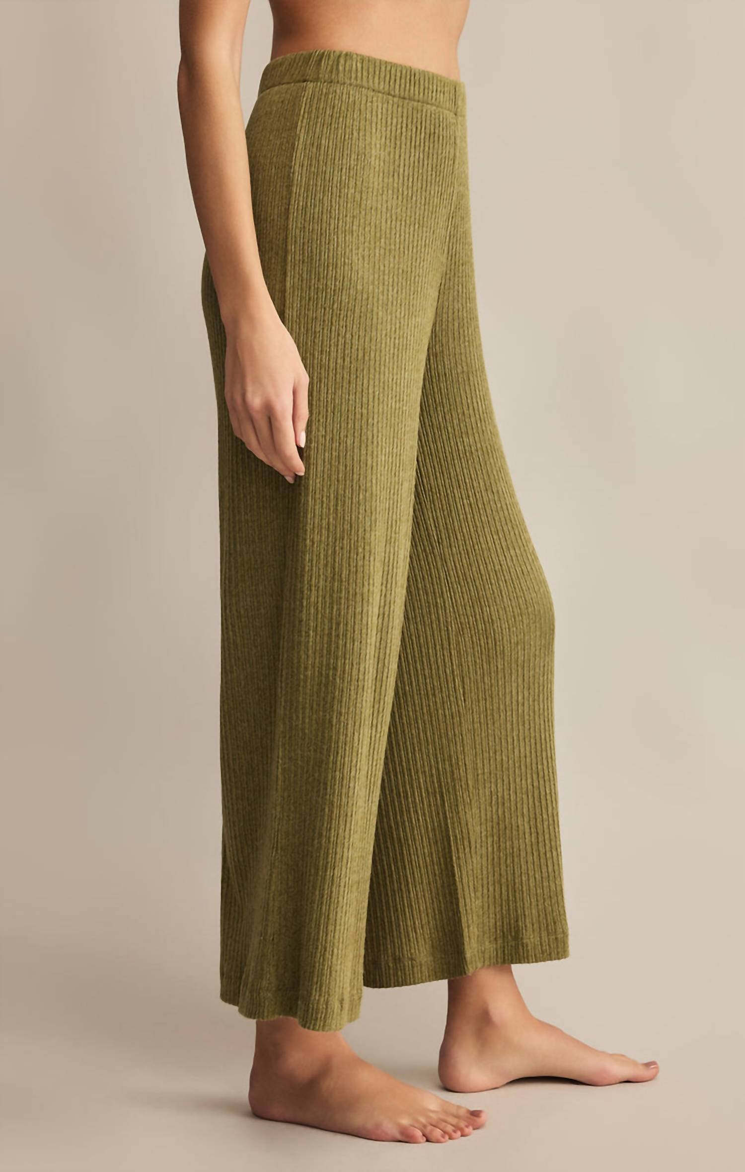 Experience effortless comfort with the Coastline Rib Pant by Z Supply. Crafted from 97% polyester and 3% spandex, these pants are designed for a relaxed fit with a wide leg and a high-rise elastic waistband. With no pockets and a pull-on closure, they are perfect for minimalist vacation wear, providing breathable softness in a stylish fern color. Care is simple with machine wash and tumble dry instructions, making them an ideal choice for summer lounging. Measurements for size XS are 36" in length and a 25 1/2" inseam, ensuring a flattering cropped-mid length fit.