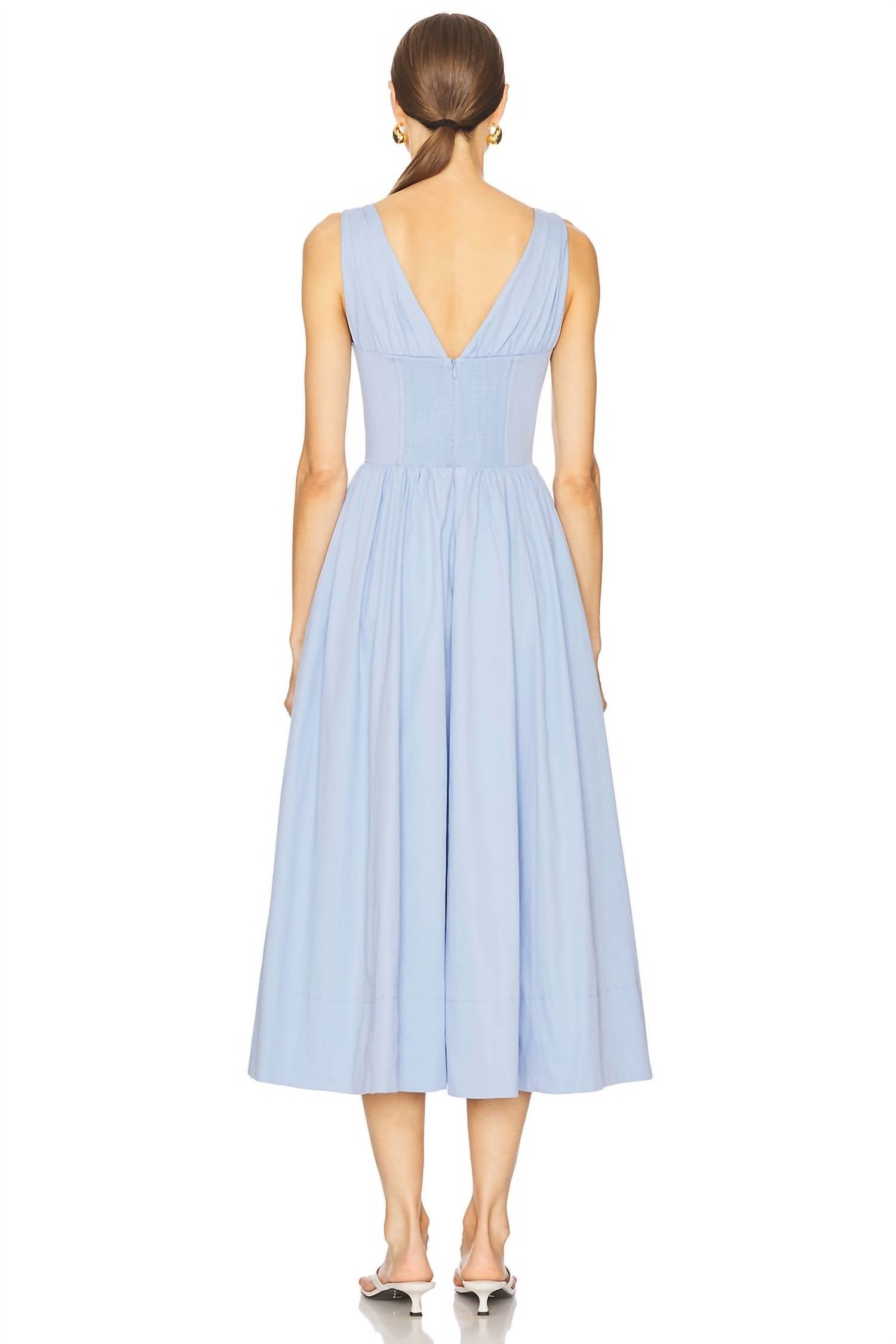 Step into elegance with ASTR's Maili Corset Poplin Midi Dress, perfect for bridal events and summer soirees. This sleeveless dress in a beautiful shade of blue showcases a flattering corset poplin design with a V-neckline and lace-up detail, complementing its A-line silhouette. Crafted from a cotton blend composed of 97% Cotton and 3% Elastane, it features functional side pockets and a concealed zip closure for an impeccable fit. Care is simple with dry clean instructions, ensuring the dress remains a timeless piece in your minimalist wardrobe.