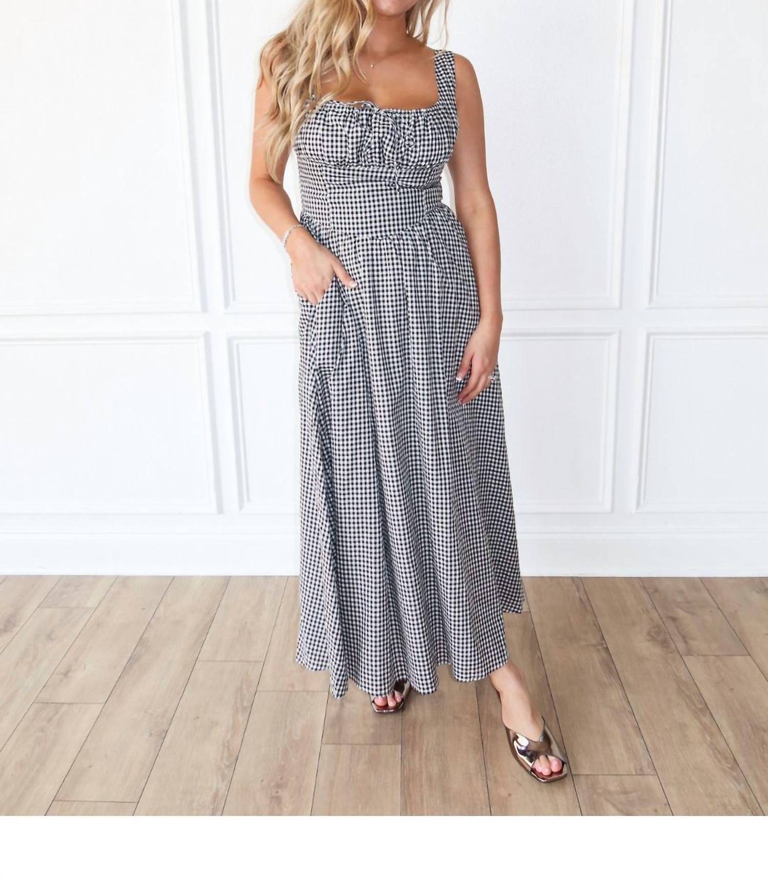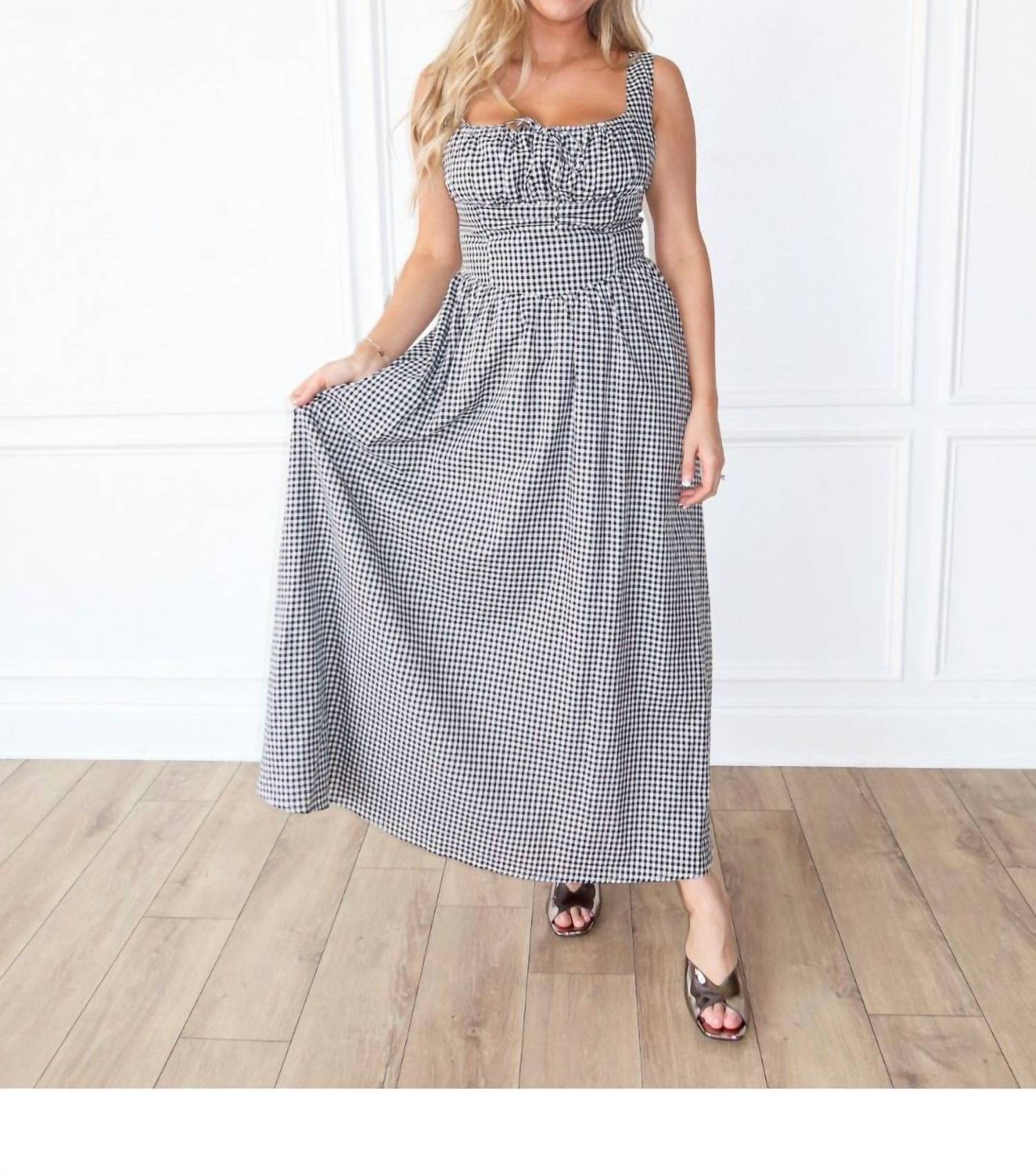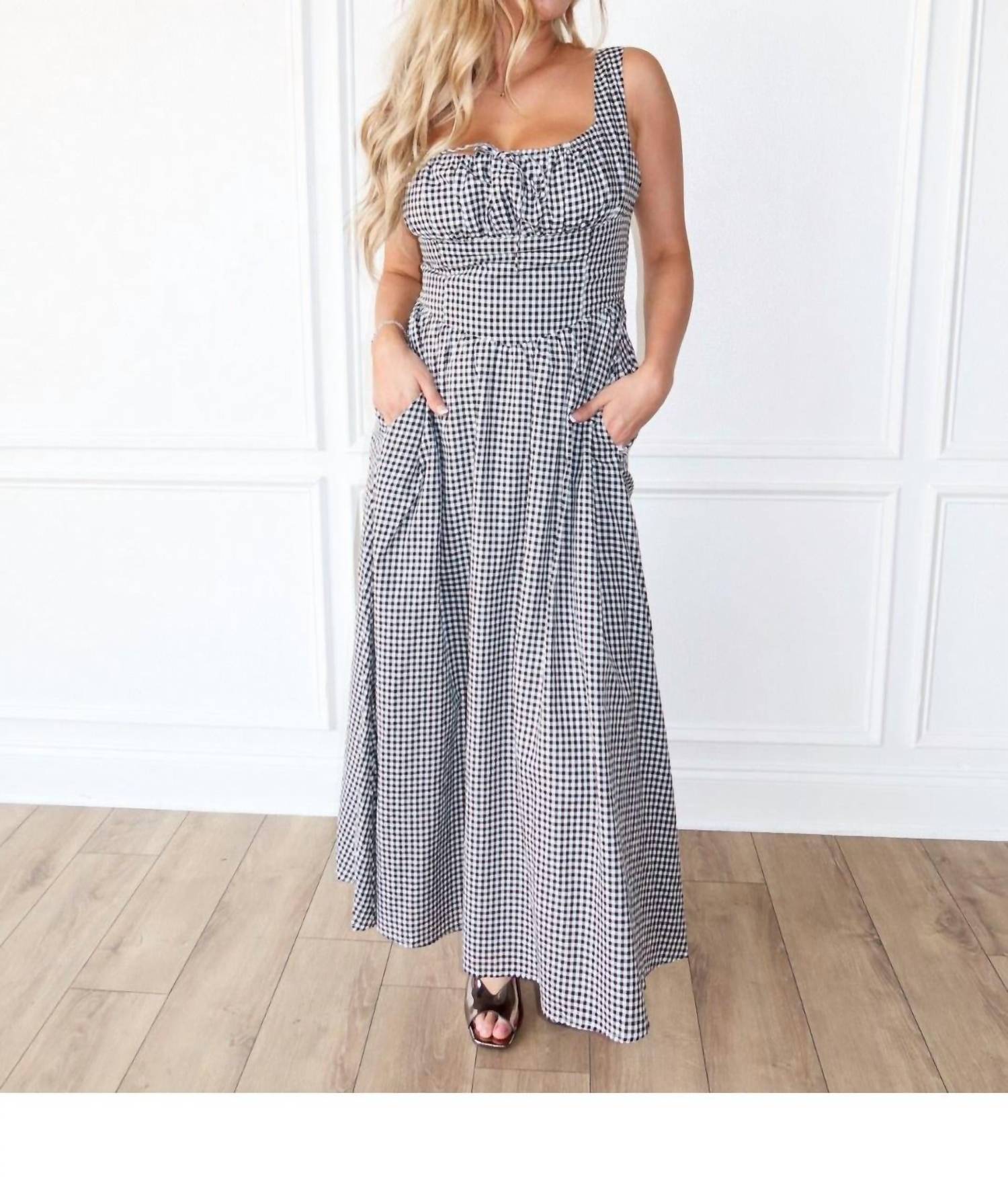 Introducing the Aureum Checkmate Corset Maxi Dress, a bold statement piece in black and white perfect for any summer occasion. This sleeveless dress is crafted from an 80% cotton and 20% polyester blend and features a fitted corset bodice with a flattering squareneck, flowing into a dramatic maxi-length skirt. Patterned in a classic gingham check, it's finished with a convenient zip closure for easy wear. Care for this dress with a cold hand wash and line dry to maintain its striking form. Available sizing offers bust measurements of 30" for small, 35" for medium, and 38" for large, with respective lengths of 52", 53", and 54".