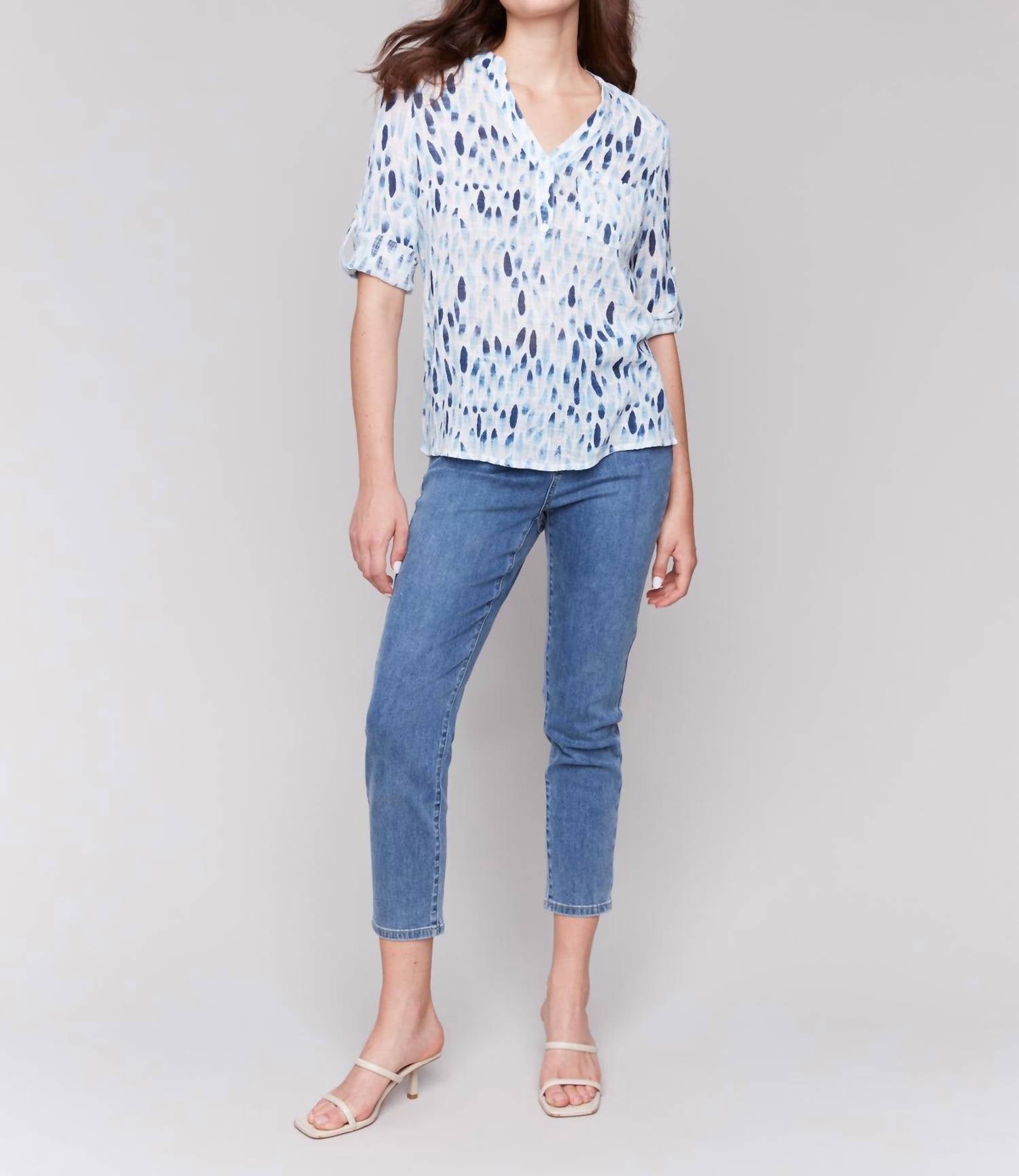Combine isso com seus jeans e chinelos favoritos para sua próxima noite entre amigas. Eleve seu estilo com a Blusa de Gaze com Mangas Dobráveis da CHARLIE B, perfeita para um look elegante para um jantar. Com mangas dobráveis três quartos e decote em V, esta blusa azul oferece versatilidade e charme elegante. Confeccionada em gaze 100% algodão respirável, apresenta uma estampa estilosa para completar seu conjunto sofisticado. Fechamento: Botão. Cuidados: Lavar à mão e secar na horizontal.