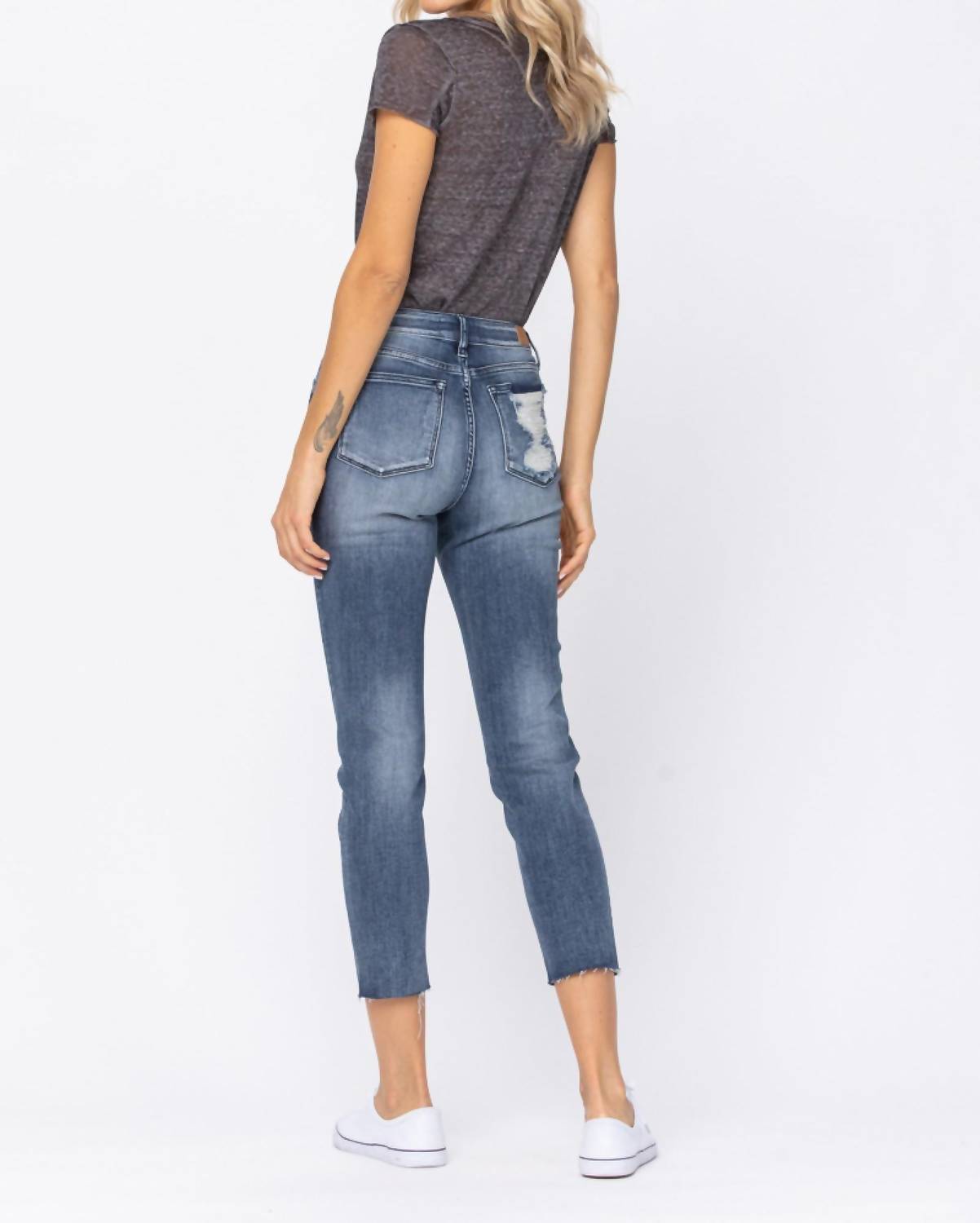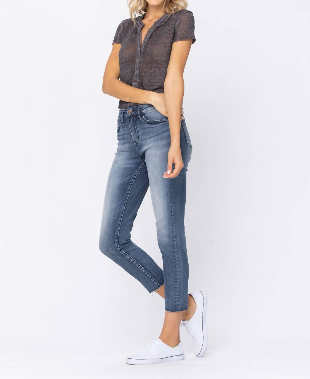 Calça jeans Judy Blue com bainha crua, cintura alta e caimento relaxado. 92% algodão / 7% poliéster / 1% elastano. CINTURA: 26 cm. COSTURA INTERNA: 68 cm. Informações da modelo: Tamanho: P. Altura: 1,75 m. Cintura: 61 cm. Quadril: 86 cm.