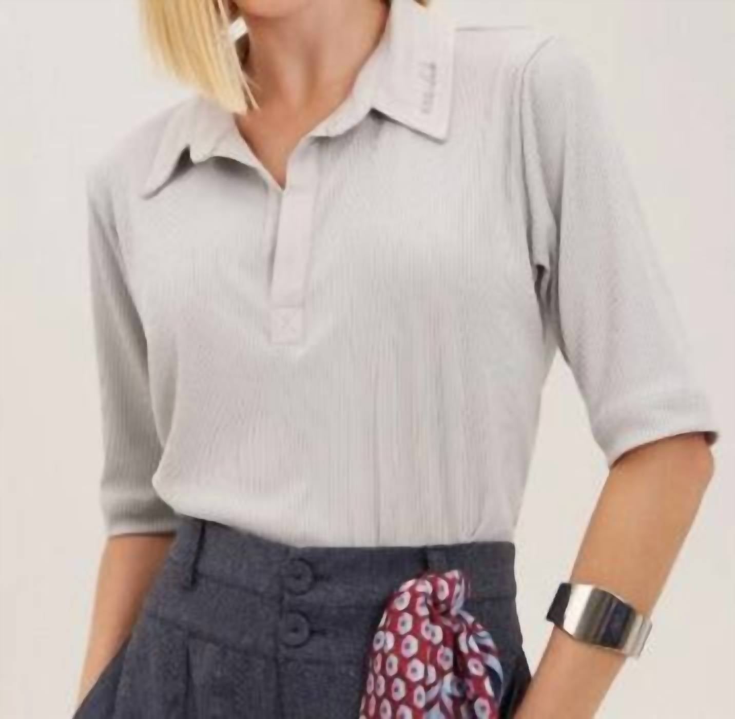 Pair this with your favorite jeans and slides for your next girls night out. Discover the Raizz Zilda Ribbed Collar Sport Blouse, a blend of casual elegance and comfort in a sophisticated gray hue. Featuring short sleeves and crafted from ribbed knit for a soft touch, this solid pattern blouse boasts a structured collar and a distinctive "RZZ CLUB" embroidered detail. Closure is a convenient pull-on style, tailored for ease and versatility. Care instructions: Hand wash only for maintaining quality and durability.