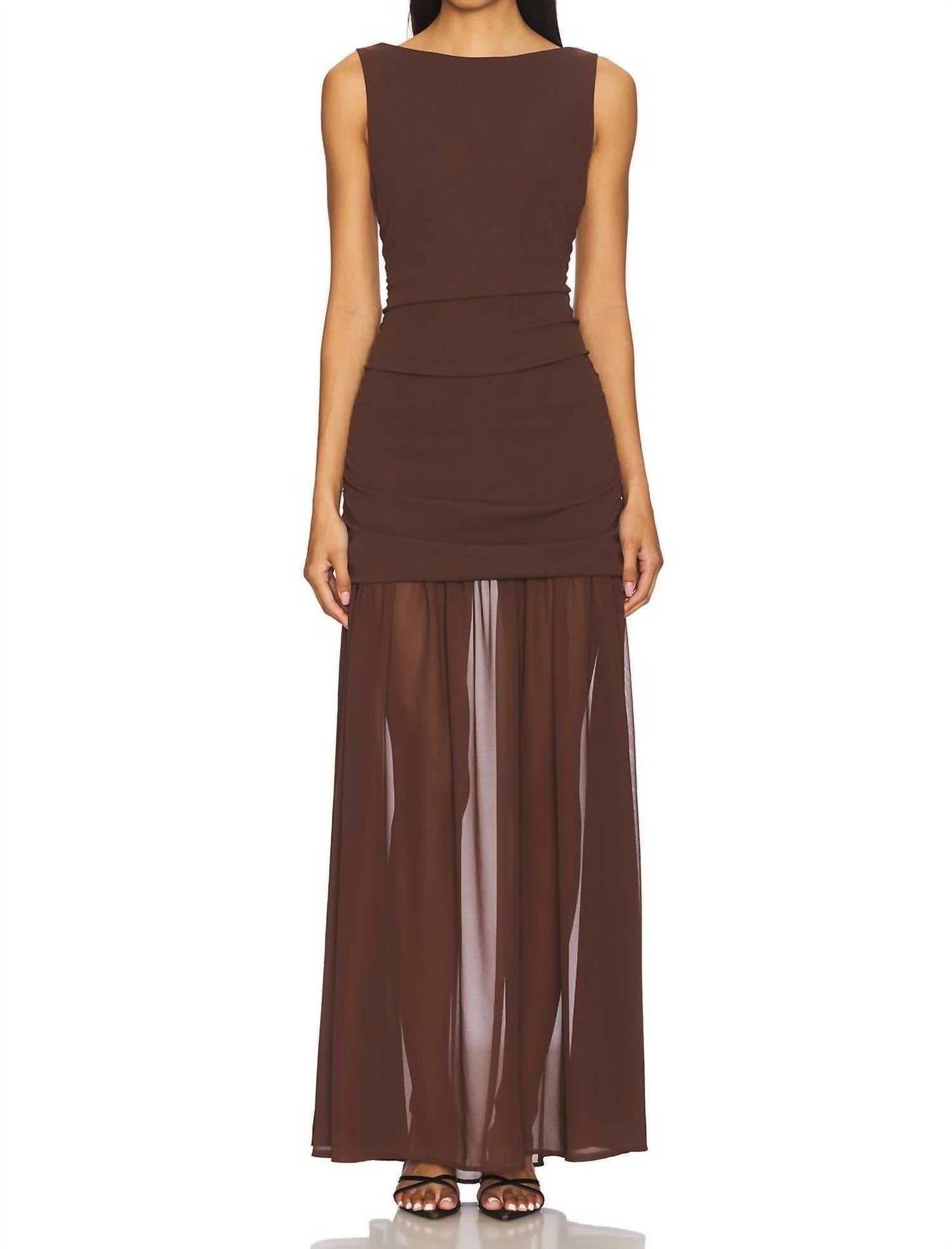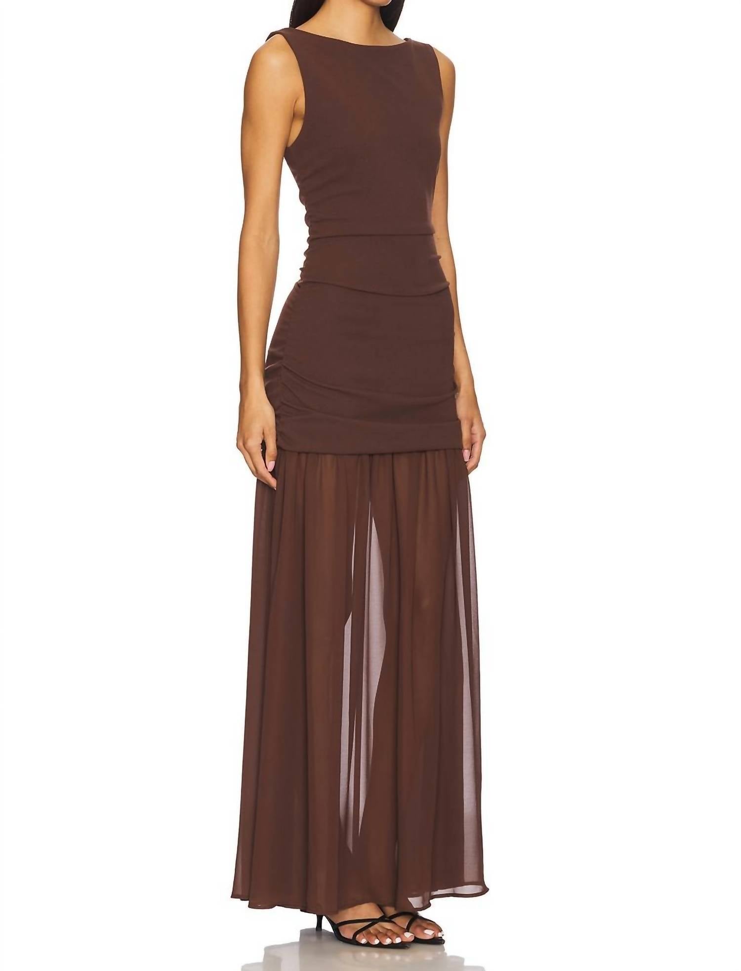 Combine este maxi com seu colar e sandálias favoritos para um look perfeito. Apresentamos o Vestido Maxi Aria da Show Me Your Mumu, uma peça deslumbrante com caimento evasê em um rico tom marrom chocolate. Este vestido sem mangas apresenta um decote canoa e uma estampa sólida, perfeito para a transição do dia para a noite. Seu comprimento midi versátil é complementado por um fecho de zíper para um ajuste seguro. Confeccionado com foco no luxo discreto, é ideal para jantares de primavera ou comemorações do Dia das Mães. Instruções de cuidado: Lavar à mão e secar na horizontal.