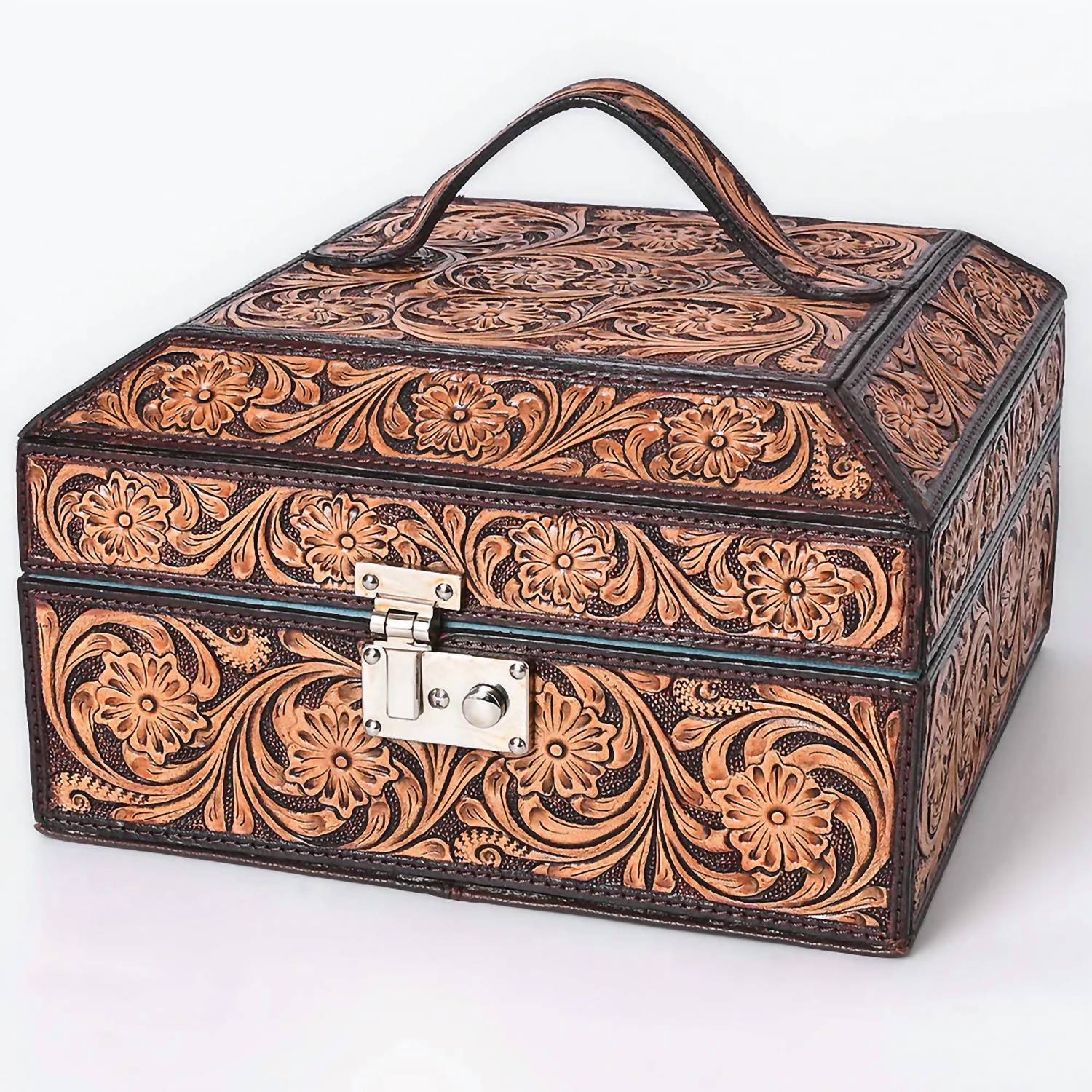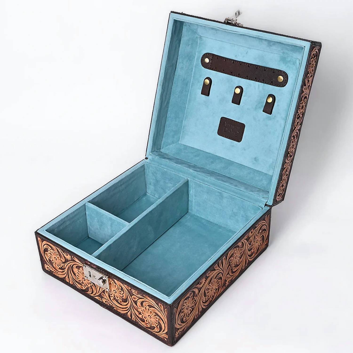 Discover the Women's Hand-tooled Leather Locking Jewelry Case by American Darling, an exquisite blend of beauty and practicality. Crafted in a striking brown and blue leather, this jewelry organizer is handcrafted to ensure each piece is unique. Made by American Darling, known for producing up to 800 designs each season in small batches. Perfect for those seeking a personalized touch in their jewelry storage.