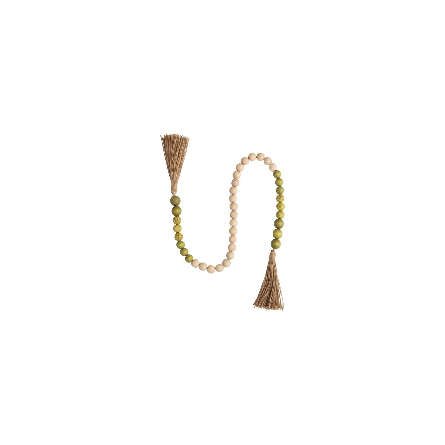 Guirlanda de contas de madeira e coco de 104 cm de comprimento com borlas de juta. Materiais: 90% contas de madeira de Gmelina, 10% juta.