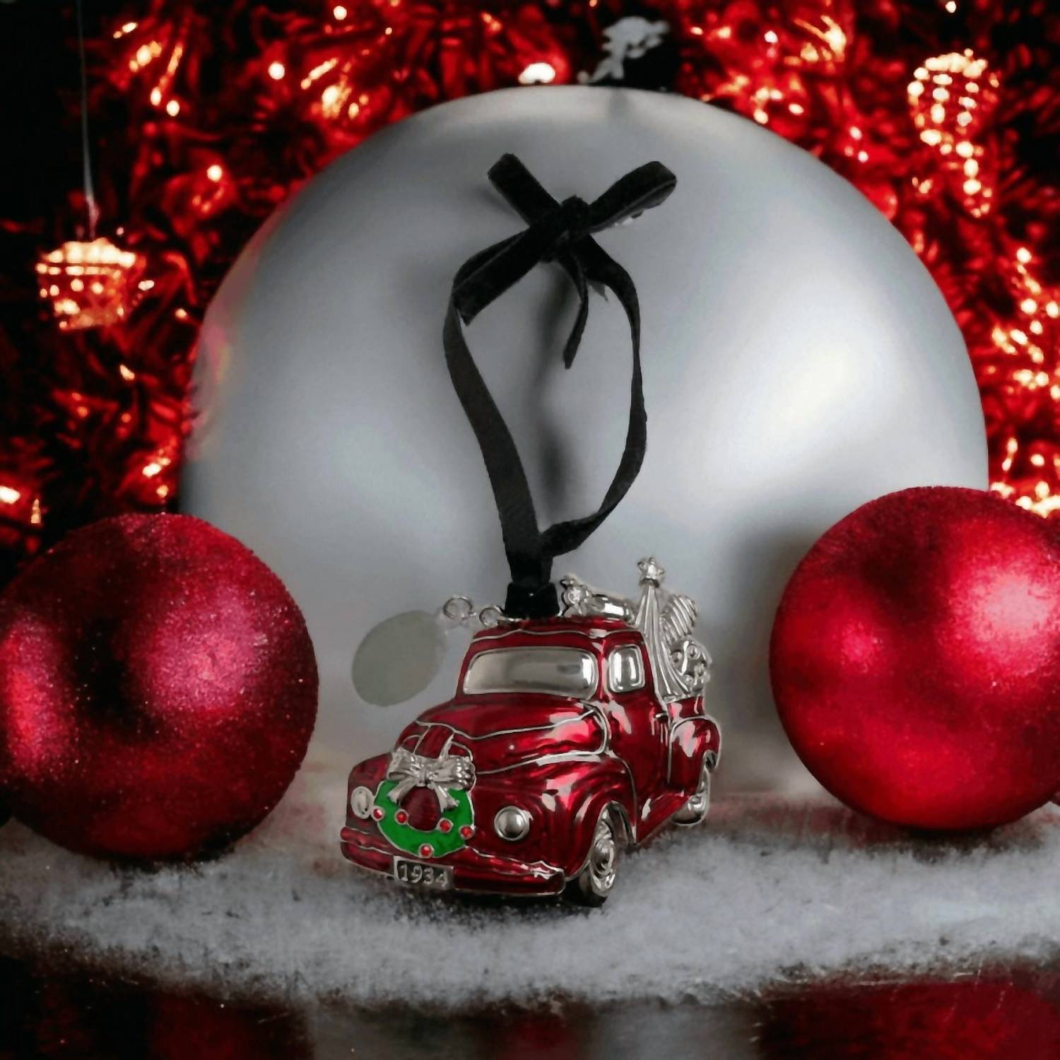 Design charmoso de caminhão vermelho em 3D. Etiqueta gravada para personalização. Dimensões: 7,5 x 7,5 cm.