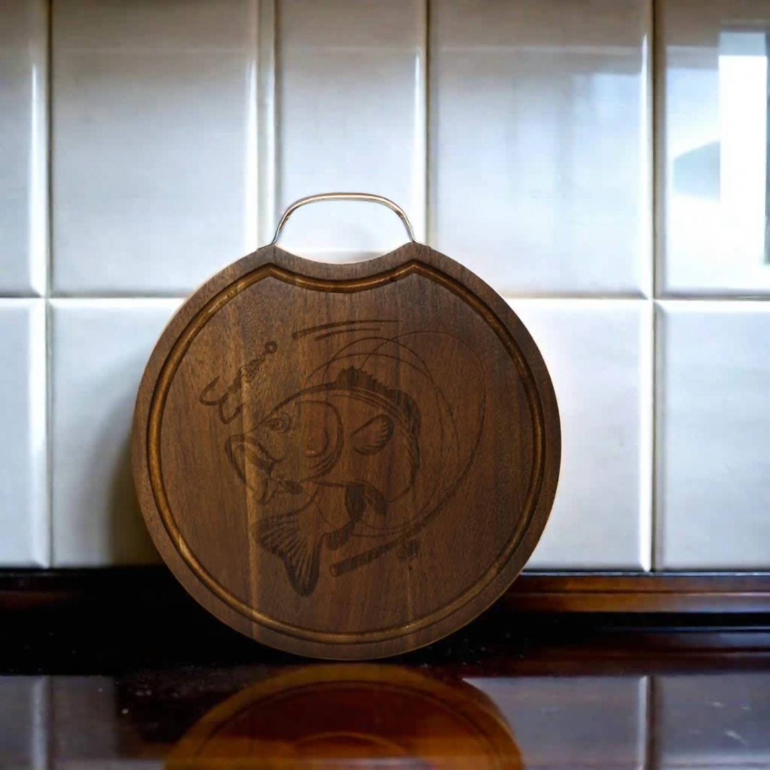 33 cm de diâmetro. Material: Madeira escura de alta qualidade. Design: Apresenta imagens detalhadas de robalo, vara de pescar e anzol. Instruções de cuidado: Recomenda-se lavar à mão em água morna com sabão para manter o acabamento.