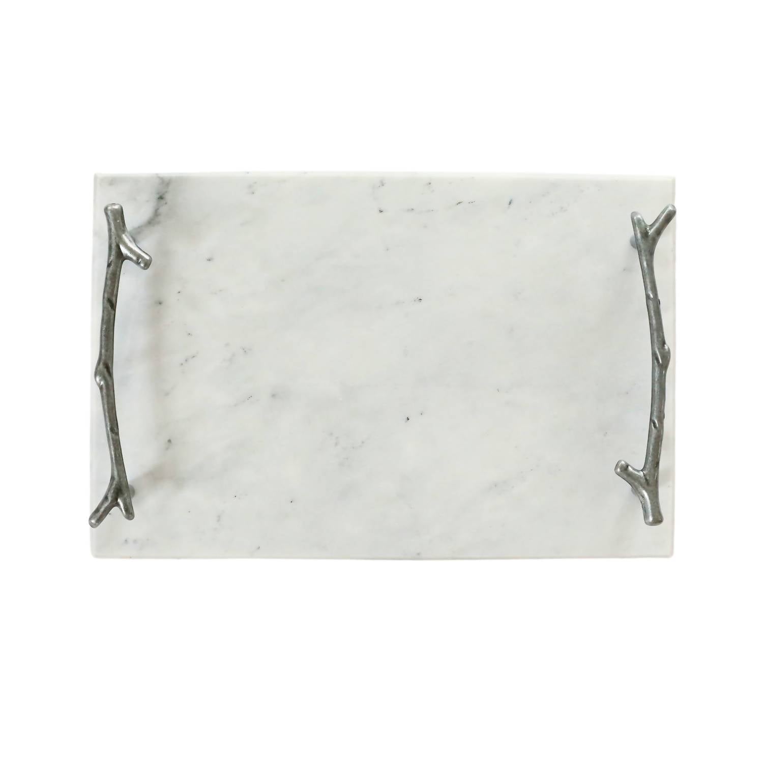 20 cm de comprimento x 30 cm de largura, proporcionando uma área substancial para suas necessidades de servir. Material: Feito em mármore branco e complementado por alças prateadas. Design funcional: A superfície fria é ideal para servir, com alças que facilitam o transporte. Recomenda-se lavar à mão para preservar a qualidade e a beleza dos materiais.