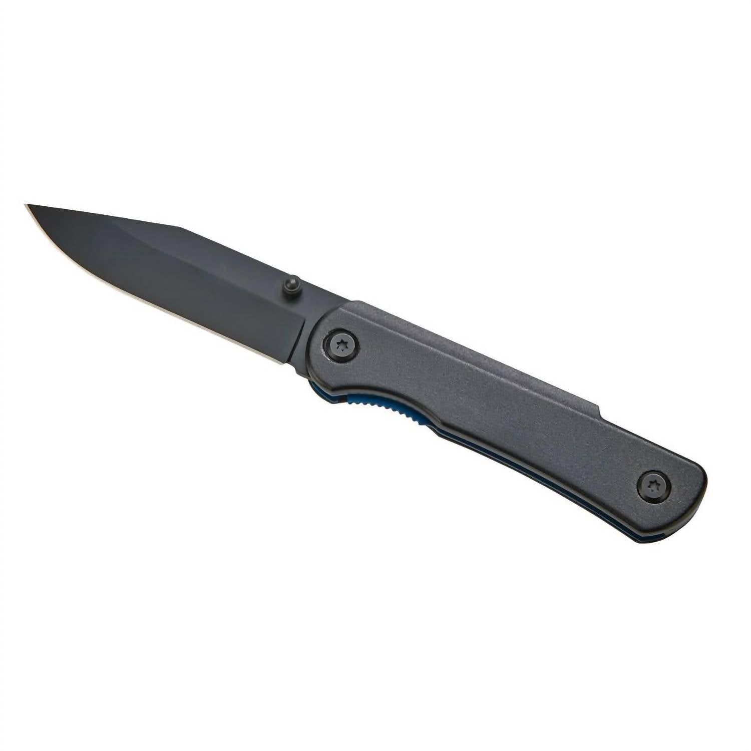 Este canivete preto tem detalhes em azul no interior e uma lâmina de aço inoxidável preta. O canivete trava no lugar quando a lâmina está totalmente aberta. Solte a trava pressionando o polegar para dobrar a lâmina de volta para dentro. O canivete dobrado mede 10 cm de comprimento e aberto mede 18 cm.
