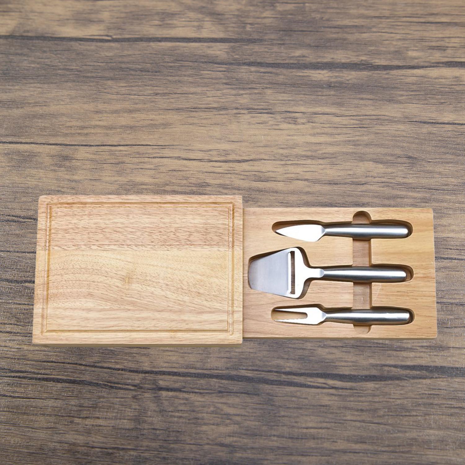 27,7 cm C x 19,5 cm L x 5 cm A. Material: Madeira de seringueira. Ferramentas incluídas: 3 ferramentas de queijo de aço inoxidável (18,2 cm a 21,6 cm de comprimento). Características: Gaveta removível para armazenamento de ferramentas, madeira de origem sustentável. Vem em uma caixa de presente branca.