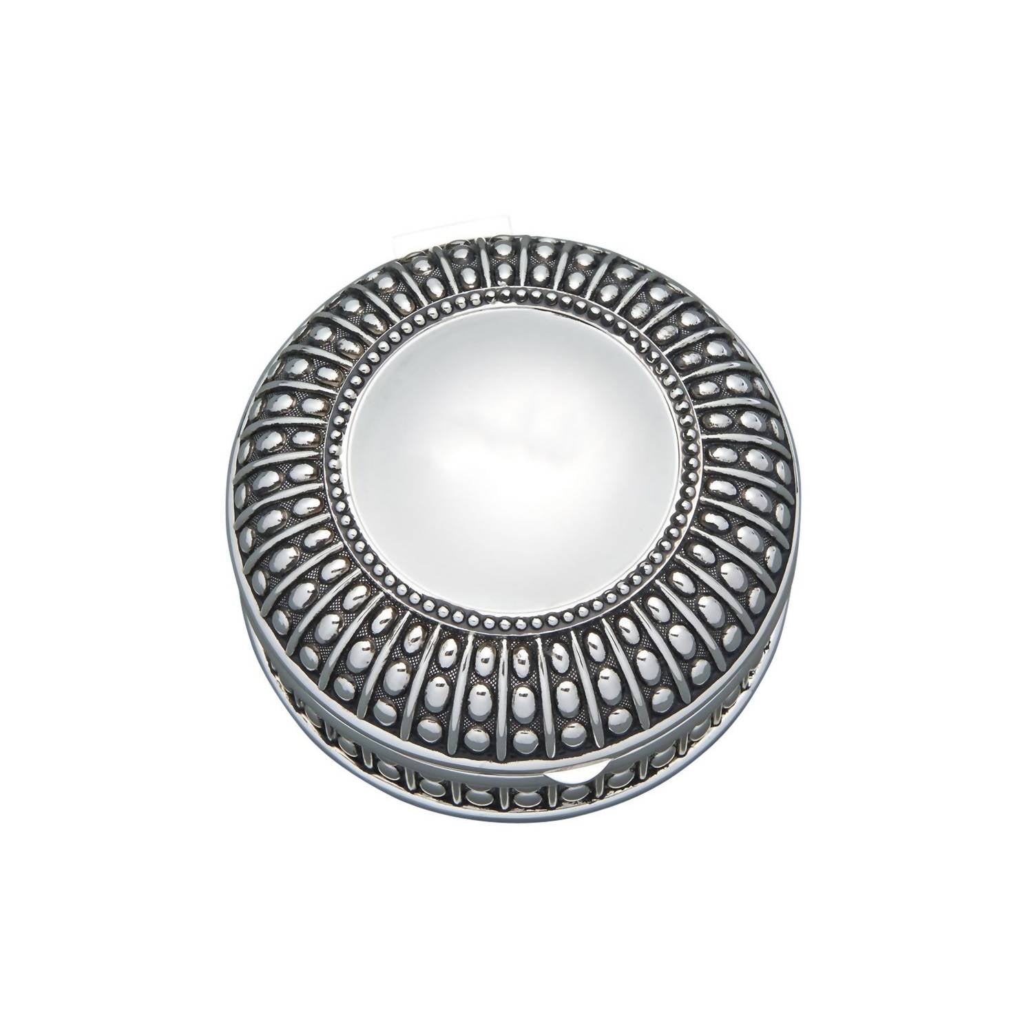 Esta caixa redonda de 4,5" de diâmetro, em estilo vintage, é banhada a prata envelhecida. A caixa é revestida com laca para evitar manchas. A tampa é articulada, e a parte interna e inferior da caixa são forradas com um tecido flocado azul-escuro. O centro da tampa não é decorado, o que permite a gravação de um monograma para personalizar este presente. A caixa possui um desenho de contas na parte inferior e um desenho de contas ao redor do centro liso da tampa. Caixa de presente prateada.