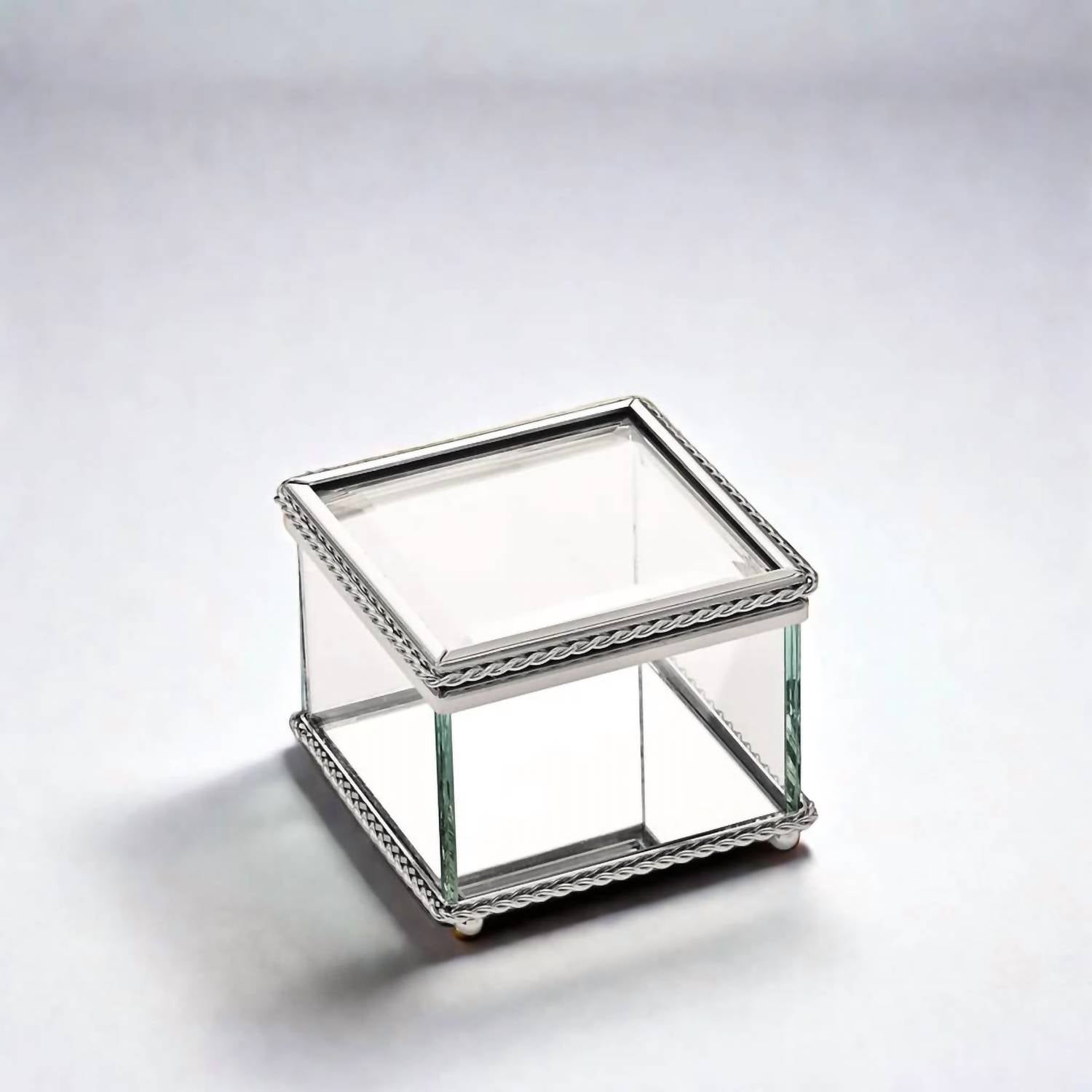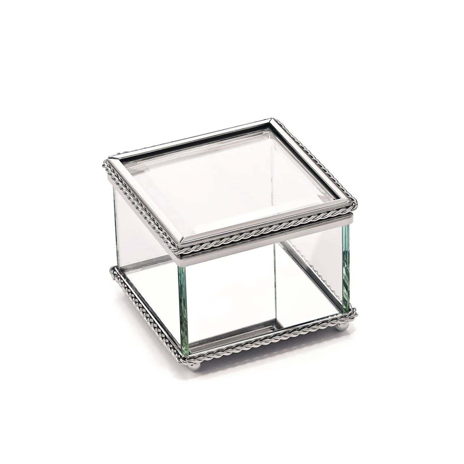 Esta linda caixa quadrada de 8,1 cm x 8,1 cm x 6,3 cm de altura é feita de vidro e possui tampa articulada. As bordas superior e inferior são revestidas com uma borda trançada que não mancha. O fundo interno é espelhado e a base da caixa possui quatro pés esféricos. Caixa de presente branca.