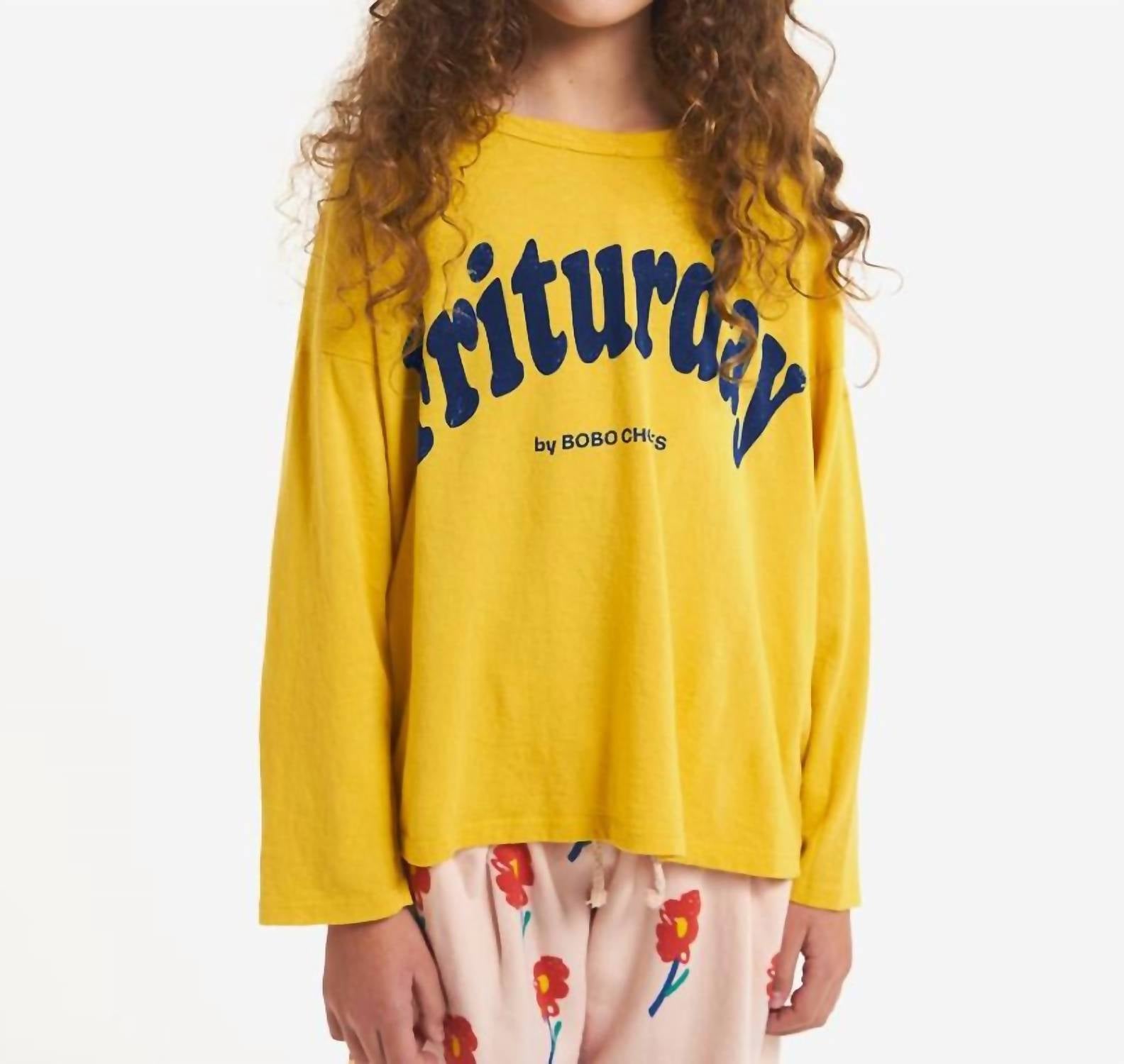 Introducing the BOBO CHOSES Kids Friturday Long Sleeve T-shirt, a vibrant yellow tee perfect for spring streetwear. Crafted entirely from 100% organic cotton, this loose-fitting top offers a comfortable and breathable fit. It features a round neck design and graphic pattern, proudly made in Spain. Ideal for engagements or everyday wear, this long sleeve t-shirt is easy to care for with machine wash instructions.
