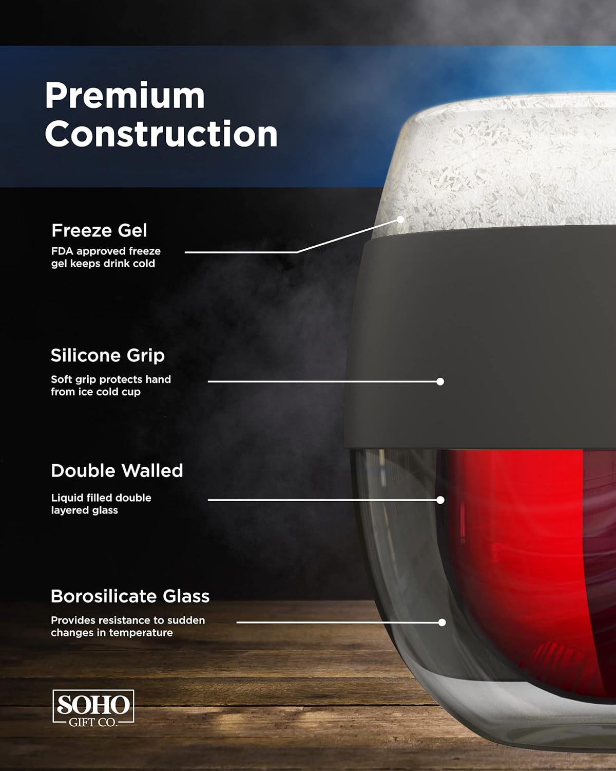 - Double walled glass with built-in freezer gel chills her wine in seconds (Recommended freeze time: 3+ hours)