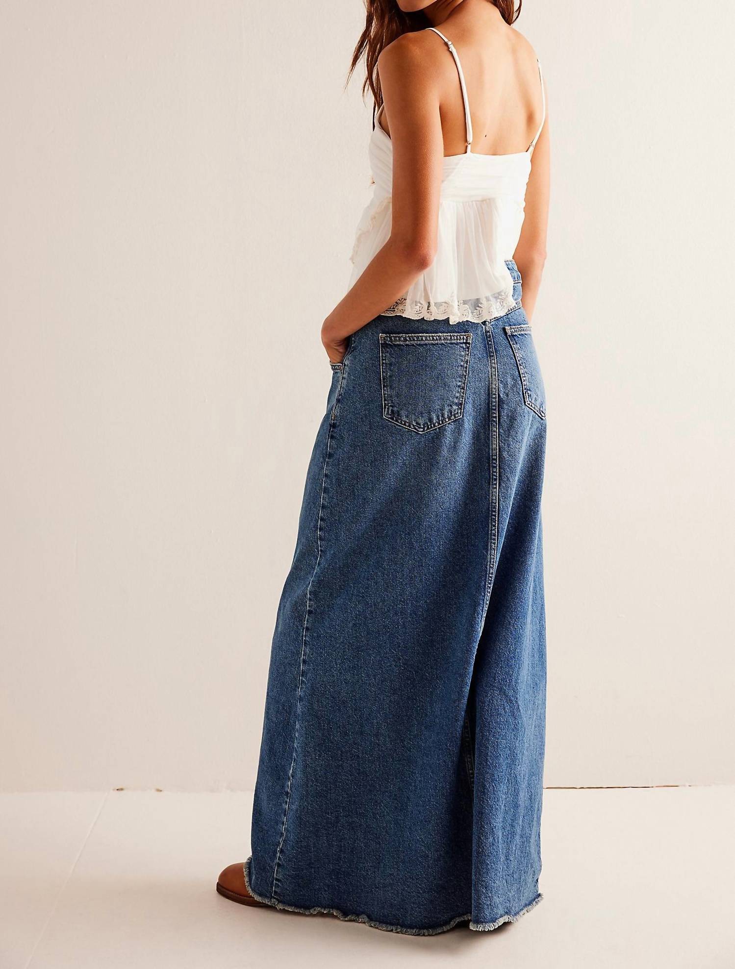 Fluida, confortável e estilosa, esta saia longa é uma das queridinhas dos fãs. Apresentamos a Saia Jeans Come As You Are da Free People, uma saia maxi essencial em tom índigo escuro. Esta peça clássica apresenta cintura média e corte em A, com um prático design de quatro bolsos e costura frontal invertida. Material: 100% algodão. Fechamento: zíper e botão. Cuidados: Lavar à máquina com água fria. Combina perfeitamente com camisetas ou regatas para infinitas opções de estilo.