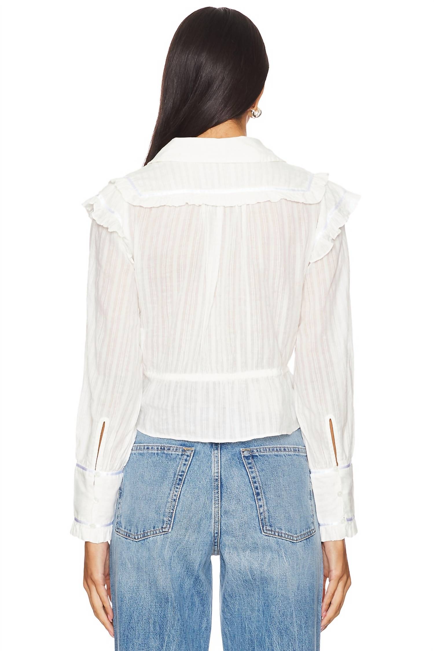 Uma blusa atemporal que nunca sai de moda. Descubra a Blusa Free People Daybreak Cinch Waist, uma adição sofisticada ao seu guarda-roupa com seu caimento relaxado e construção em algodão macio. Esta blusa listrada em branco clássico apresenta mangas longas com punhos abotoados, um decote em V profundo e um detalhe feminino de amarração frontal ajustável. Feita na Índia com tecido popeline de gramatura média, possui fecho frontal com botões e acabamento semitransparente para um toque delicado. As instruções de cuidado recomendam lavagem à mão e secagem no varal para melhor conservação da peça.
