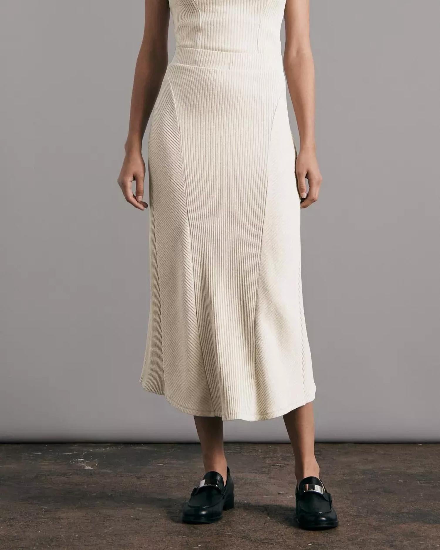 Coloque sua camiseta favorita por dentro desta saia midi para um look descolado e descolado. Troque do trabalho para o fim de semana com esta saia canelada slim fit. Este modelo evasê, com modelagem pull-on, é feito de uma mistura de algodão que se ajusta perfeitamente aos lugares certos, tornando-o confortável o suficiente para usar o dia todo (e a noite toda).