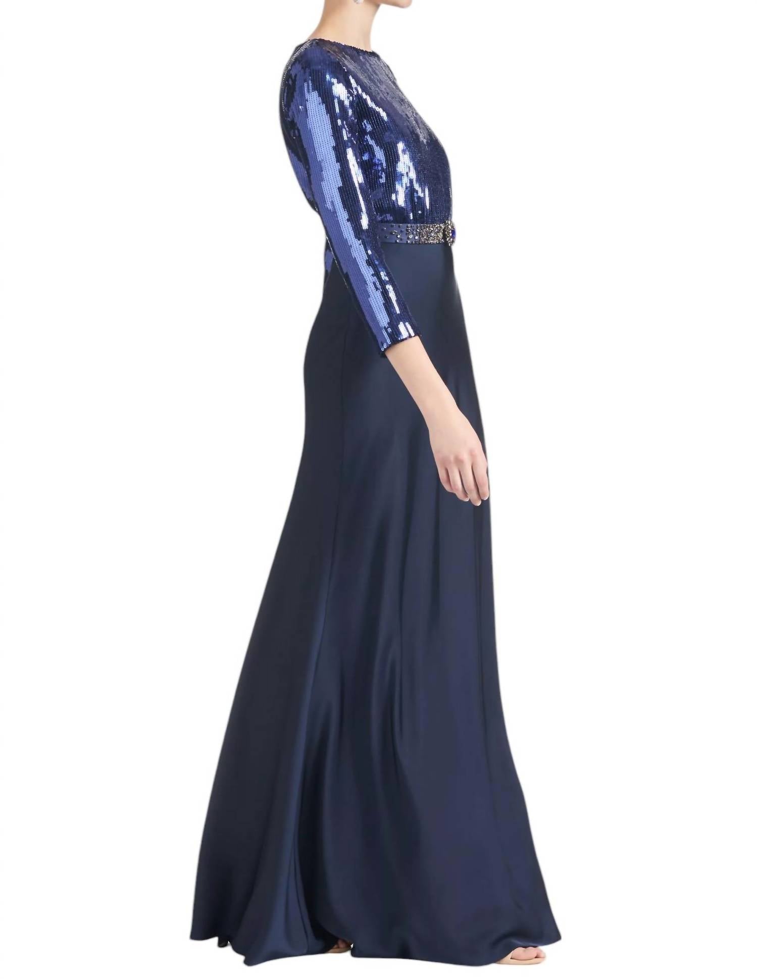 Apresentamos o vestido Christabel da SACHIN & BABI, uma deslumbrante personificação da elegância clássica com um toque festivo. Este vestido maxi fit e flare apresenta mangas três quartos e um cativante decote canoa, com um corpete todo em lantejoulas contrastando com uma luxuosa saia de crepe de cetim em tons safira e meia-noite brilhantes. É confeccionado em 95% poliéster e 3% elastano, garantindo conforto e estilo. O vestido é longo, medindo 152 cm do topo do ombro até a bainha inferior, com um prático fecho de zíper nas costas.