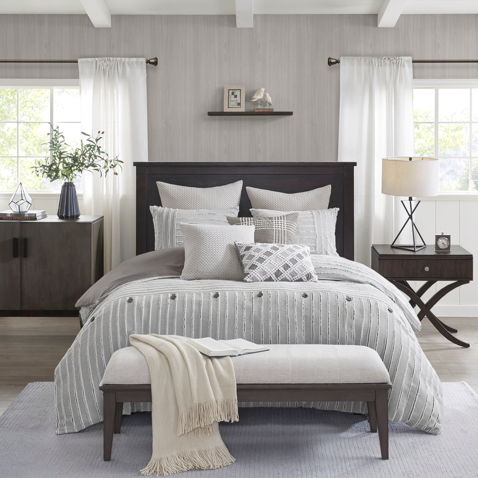 Experimente o máximo conforto e estilo com o conjunto de edredom grande de algodão com recortes em jacquard Madison Park Signature Essence. Este luxuoso conjunto inclui um edredom, fronhas Euro e almofadas decorativas para completar seu conjunto de cama. O tecido de algodão com recortes em jacquard oferece um toque suave ao mesmo tempo que adiciona uma textura elegante à decoração do seu quarto.