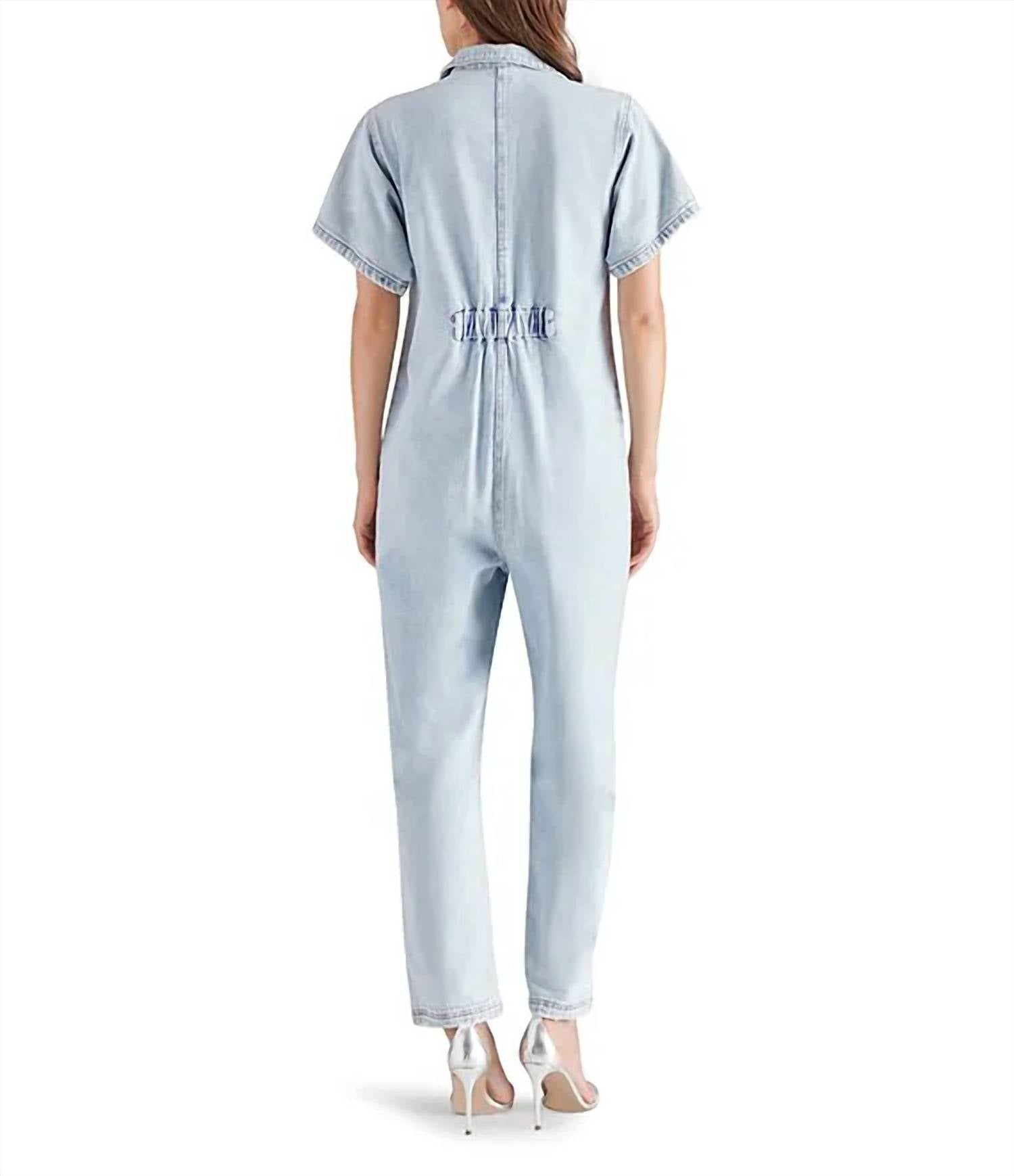 Não é preciso muito para que esta peça fique descolada sem esforço. Adicione algumas joias chamativas para dar um toque especial ou calce tênis para um visual mais casual. Arrase com um visual moderno, casual e descolado com este macacão jeans com elastano, com corte relaxado e modelagem ajustada por um painel elástico nas costas. Costura interna de 28" (tamanho pequeno) Fecho de zíper frontal Colarinho aberto Mangas curtas Bolsos frontais de remendo 95% algodão, 4% poliéster, 1% elastano Lavar à mão e secar na horizontal Importado