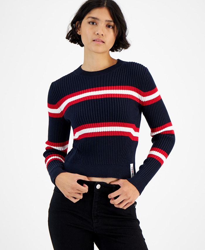 Tommy Jeans Feminino Listrado Canelado Manga Longa Gola Redonda Suéter Azul Tamanho Grande