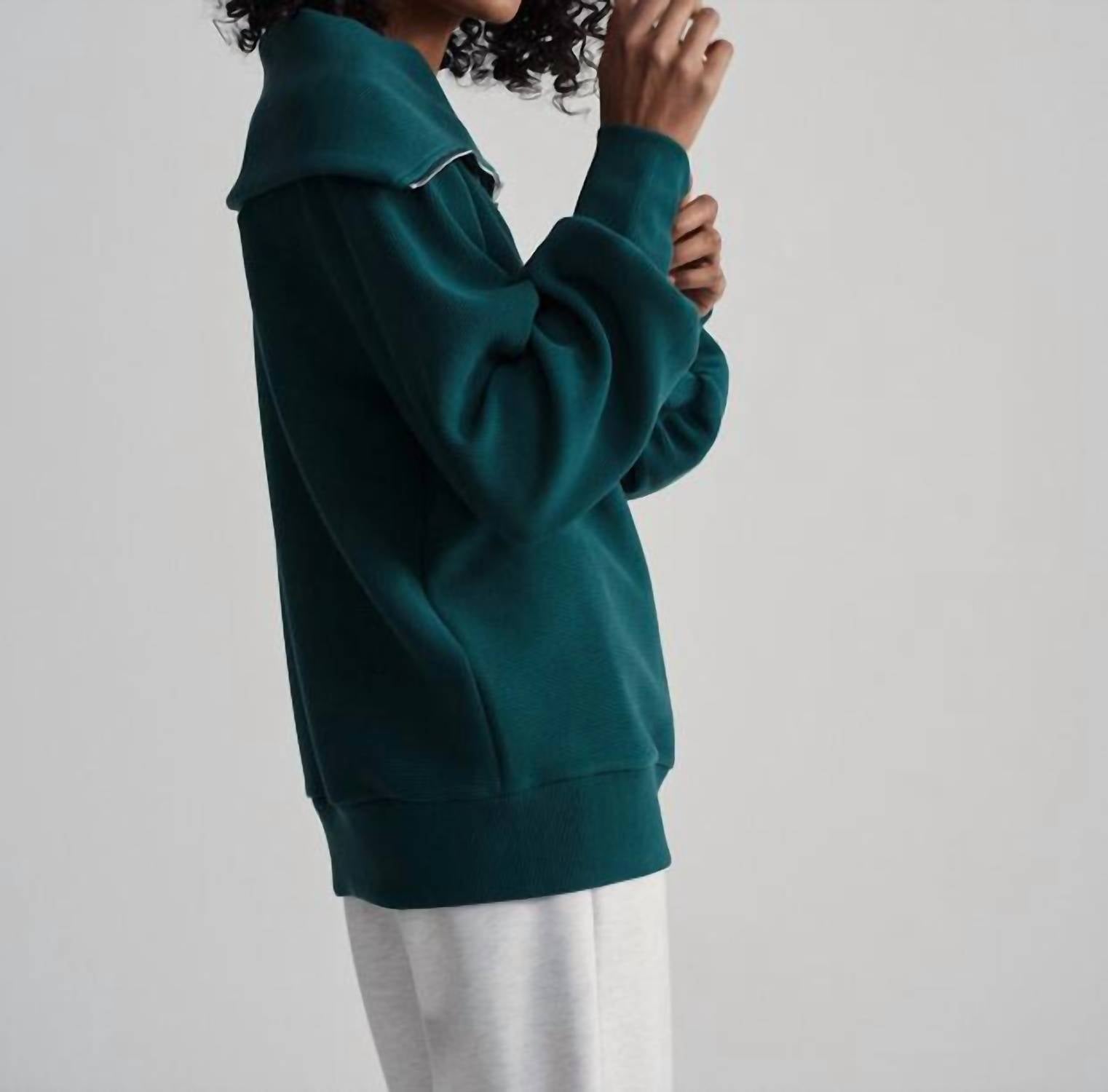 Este pulôver oversized com meio zíper apresenta gola alta e mangas amplas, confeccionado em 53% algodão, 46% poliéster e 1% elastano. Mede 63 cm de comprimento frontal e 66 cm de comprimento nas mangas. Adequado para usar sobre leggings ou calças de moletom, é lavável à máquina em água fria; não usar alvejante nem secar na secadora; e passar a ferro em temperatura baixa, se necessário. A modelo tem 177 cm de altura e veste tamanho P.