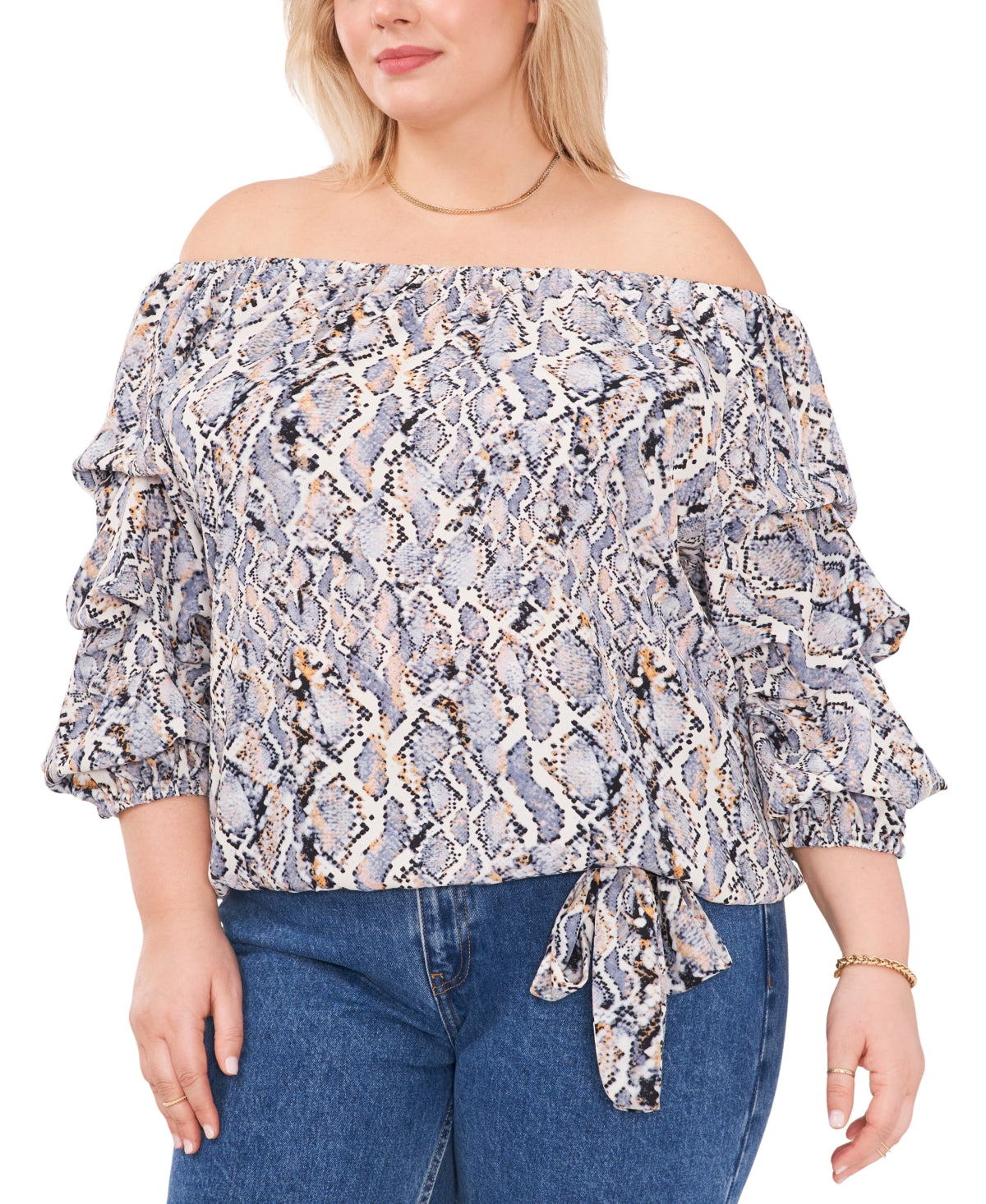 Mangas bufantes volumosas emolduram artisticamente esta blusa com ombros descobertos, coberta com uma estampa de cobra estilosa e finalizada com uma graciosa gravata na bainha. Comprimento 26 por 12. Decote ombro a ombro. Mangas três quartos. 100% poliéster. Lavagem à máquina. Secagem em tambor. Importado.