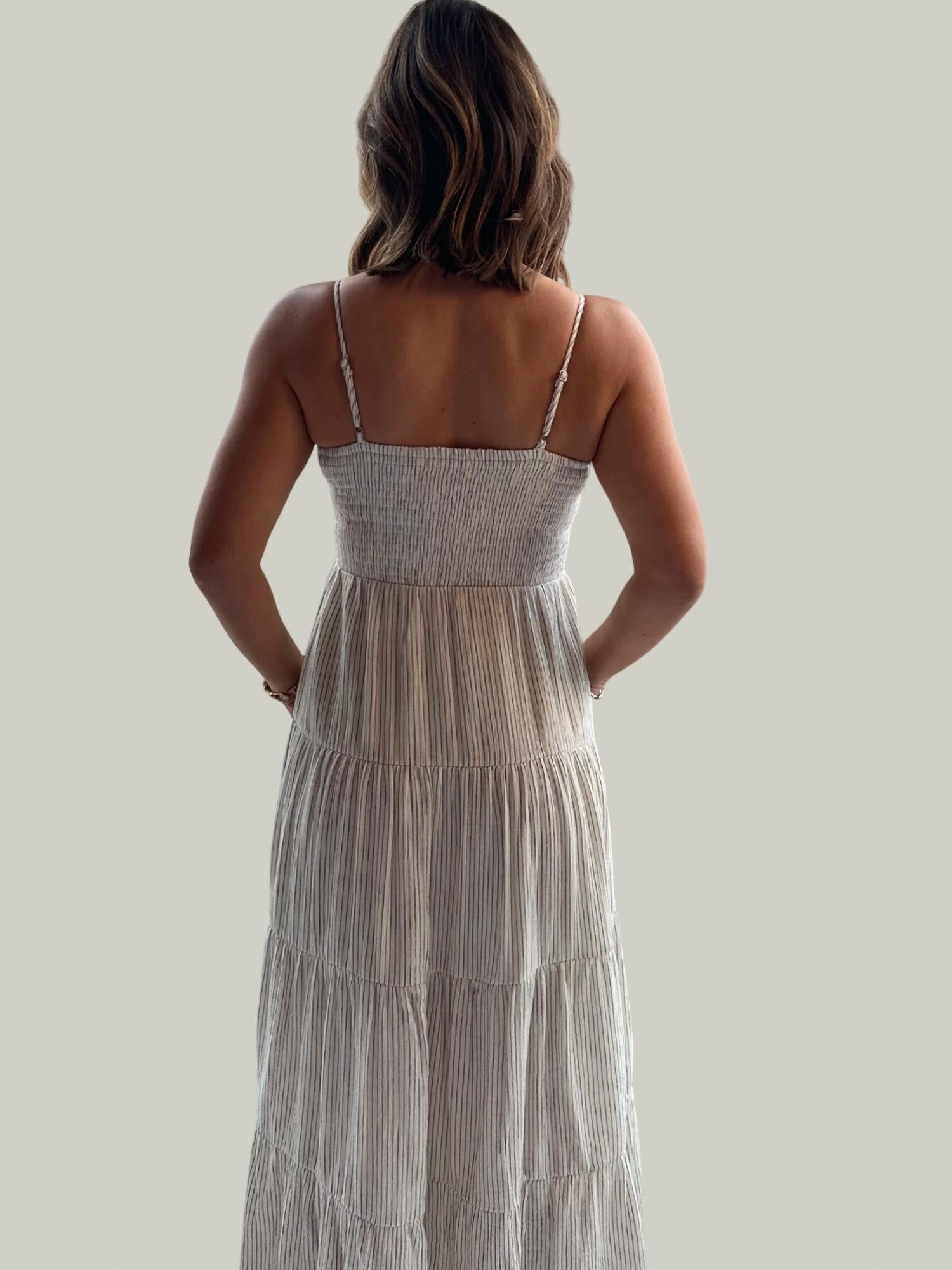 Combine este maxi com seu colar e sandálias favoritos para um look perfeito. Apresentamos o Vestido Longo Listrado Balos da Z Supply, uma peça chique e despojada para o seu guarda-roupa de verão. Este vestido possui alças finas e decote quadrado, confeccionado em gaze 100% algodão com um padrão listrado marcante. Com comprimento longo, ele foi criado para dias ensolarados, com uma saia ampla e fluida, proporcionando um visual descontraído. As instruções de cuidado recomendam lavar à máquina com água fria e pendurar para secar, ou optar pela lavagem a seco para melhores resultados.