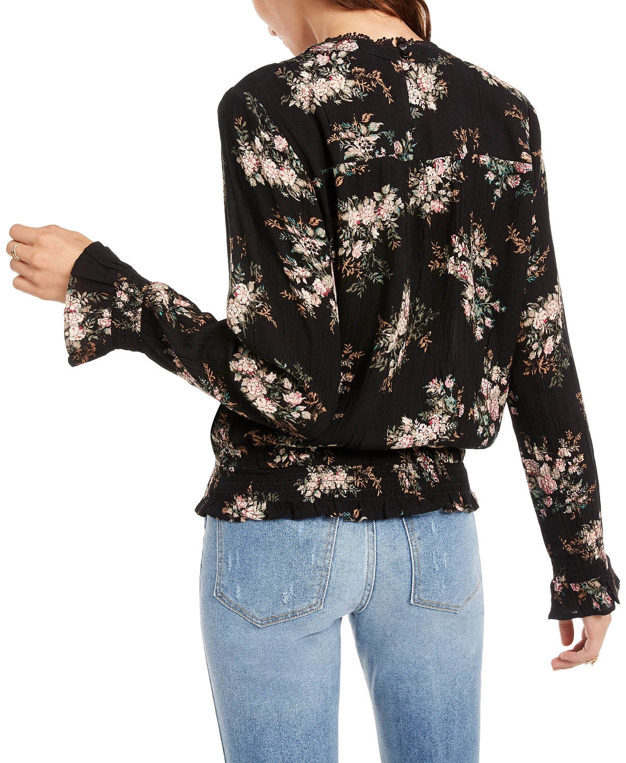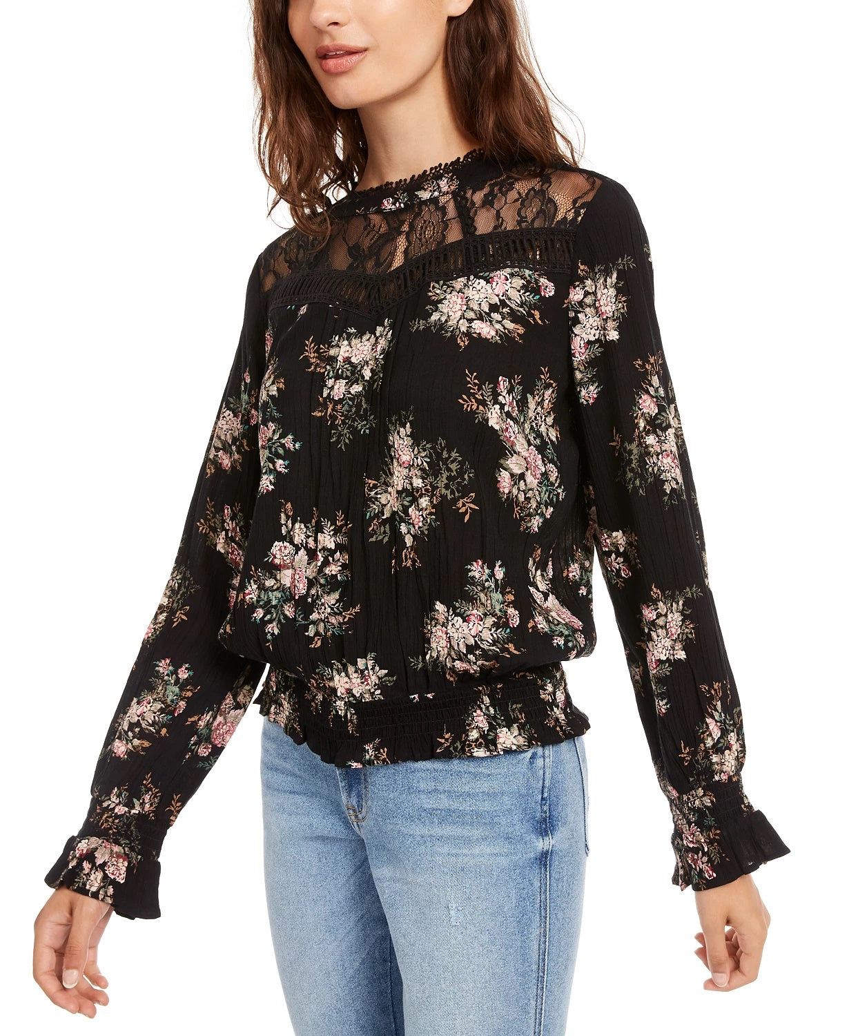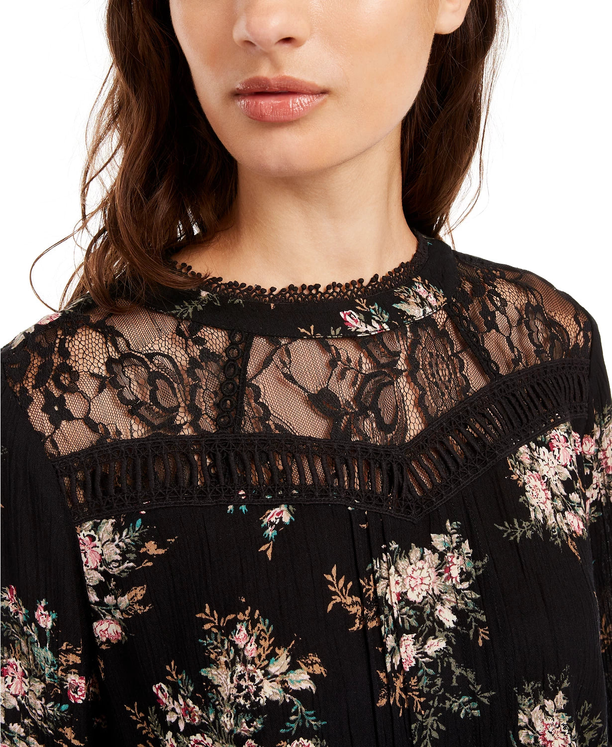 Caimento relaxado; ajuste na cintura | Gola redonda; fecho de dois botões nas costas | Acabamento em renda; cintura elástica franzida; disponível em cor lisa ou estampada | Mangas compridas com punhos elásticos com babados | Poliéster/algodão; renda: poliéster