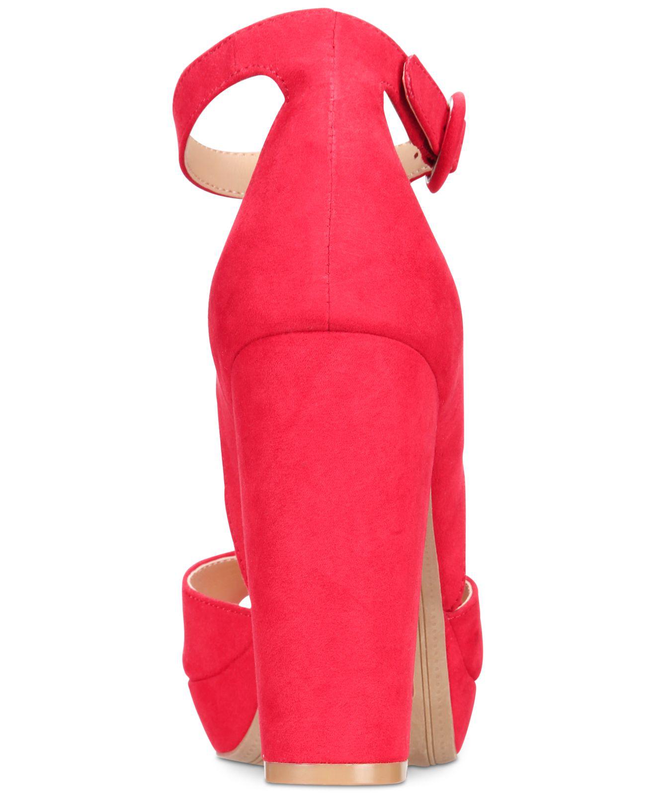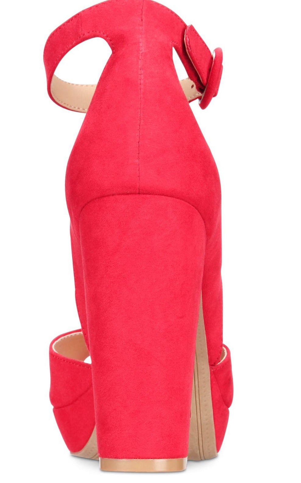 Sandálias plataforma redondas peep toe com tira no tornozelo | Fecho de fivela ajustável na tira do tornozelo | Salto bloco envolto de 4-1/4", plataforma de 1 polegada | Disponível em tamanho M (M) e G (L) | Cabedal de tecido ou sintético; sola sintética | Importado