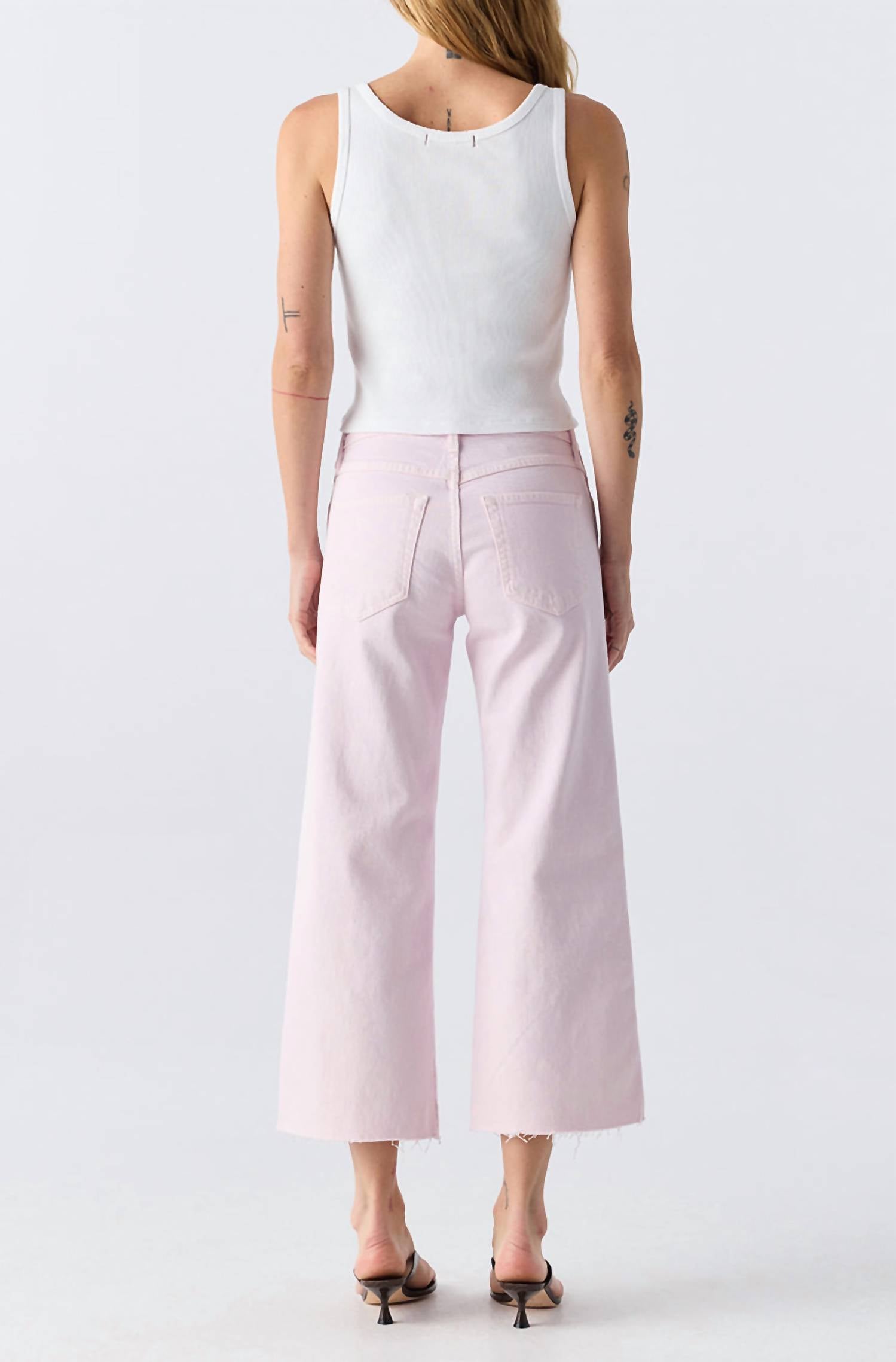 Elevate your denim collection with the AMO Marjorie Jean in Flush, expertly crafted for a modern, relaxed fit. These women's jeans feature a mid-rise, wide-leg silhouette with a cropped raw hem, perfect for showing off your favorite shoes. Made from a premium blend of 98% cotton and 2% elastane, they provide comfortable stretch and a versatile light wash. Closure is a classic zip fly, and they're designed for effortless machine wash care. Model Sarah wears a size 25 and stands at 5'9.5", with an inseam of 26", a front rise of 10.25", a back rise of 14.75", and a leg opening of 22.5".