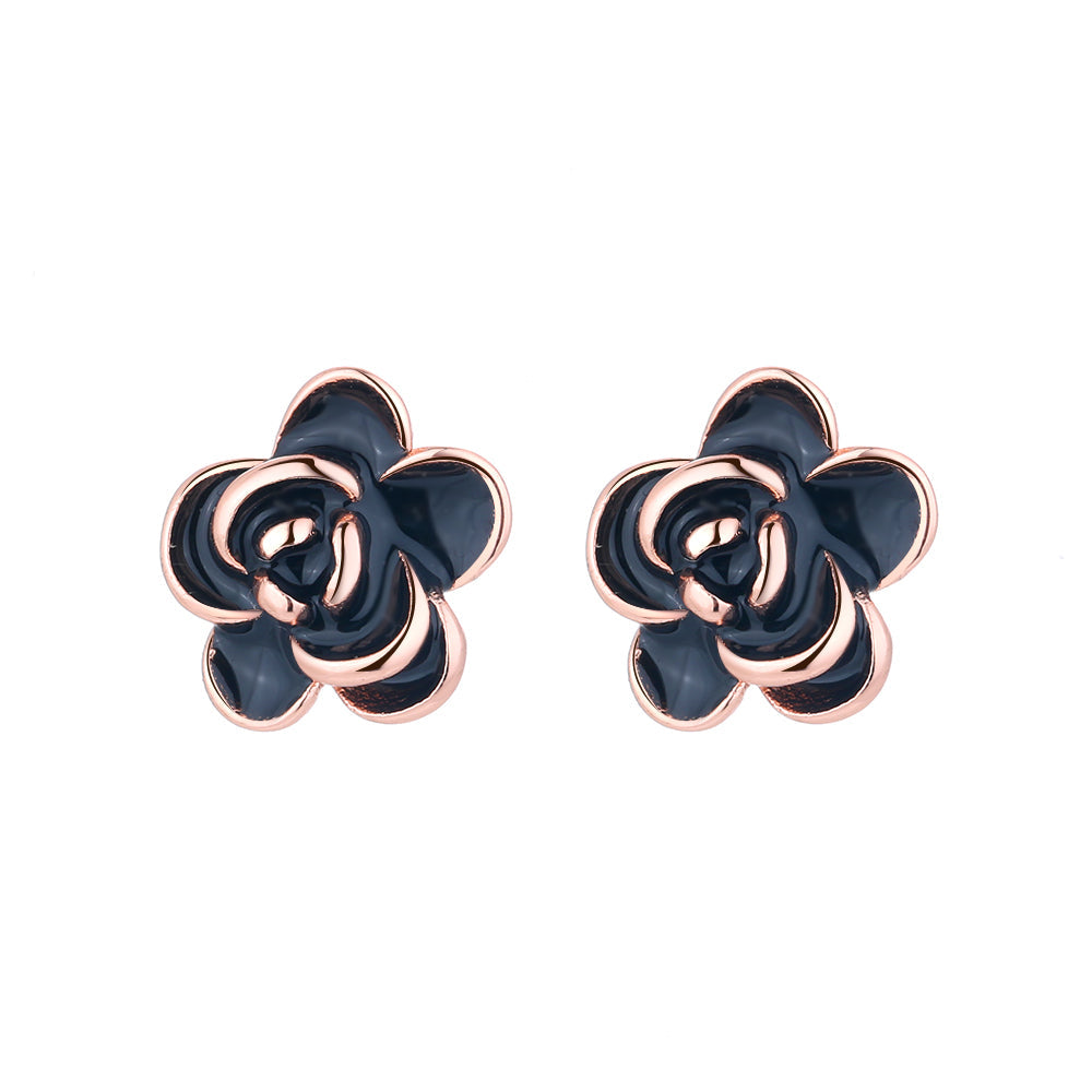 A peça central do brinco é uma flor oxidada lindamente detalhada que adiciona um toque de charme vintage ao design geral. A flor apresenta detalhes complexos, incluindo pétalas delicadas e um centro texturizado, realçados pelo acabamento oxidado. Isso cria um contraste encantador entre o metal escurecido e o revestimento em ouro rosa quente.