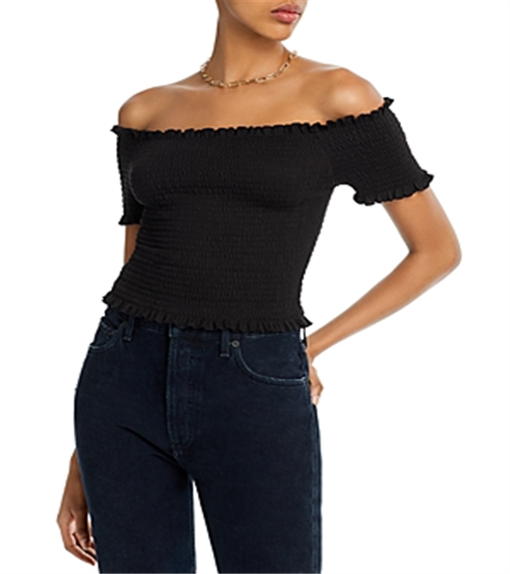 Top curto Aqua feminino com babados e ombros de fora, preto, tamanho P