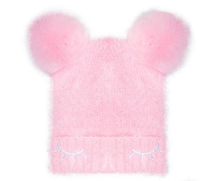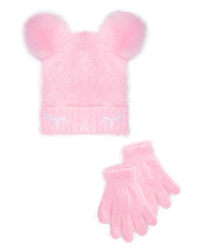 Pompons fofinhos de pele sintética realçam a fofura do adorável chapéu do conjunto da ABG, que também inclui um par de luvas combinando. Chapéu: pompons duplos de pele sintética na parte superior; detalhe de cílios na aba. Luvas: punhos canelados. Chapéu: poliéster; pele sintética: acrílico; luvas: acrílico/poliéster/elastano. Lavar à mão.