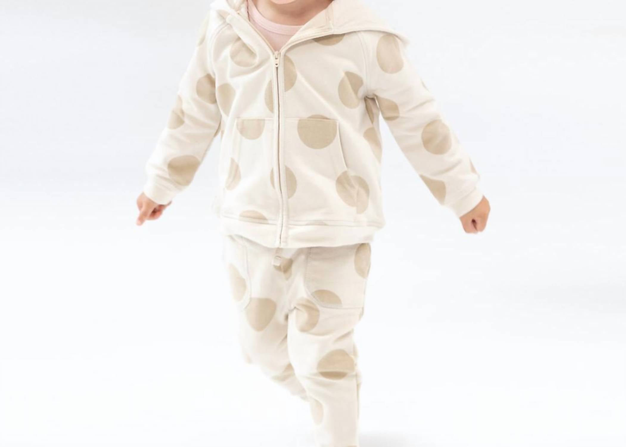 The Kid's French Terry Dot Hoodie and Jogger Set by ANGEL DEAR offers a playful yet stylish look in a cute beige tone. Made from soft fleece, this set features a big dot print, making it both cozy and fun for kids. The versatile pieces can be worn together or separately, allowing for multiple outfit options. Ideal for adding charm to a child's wardrobe with ease.