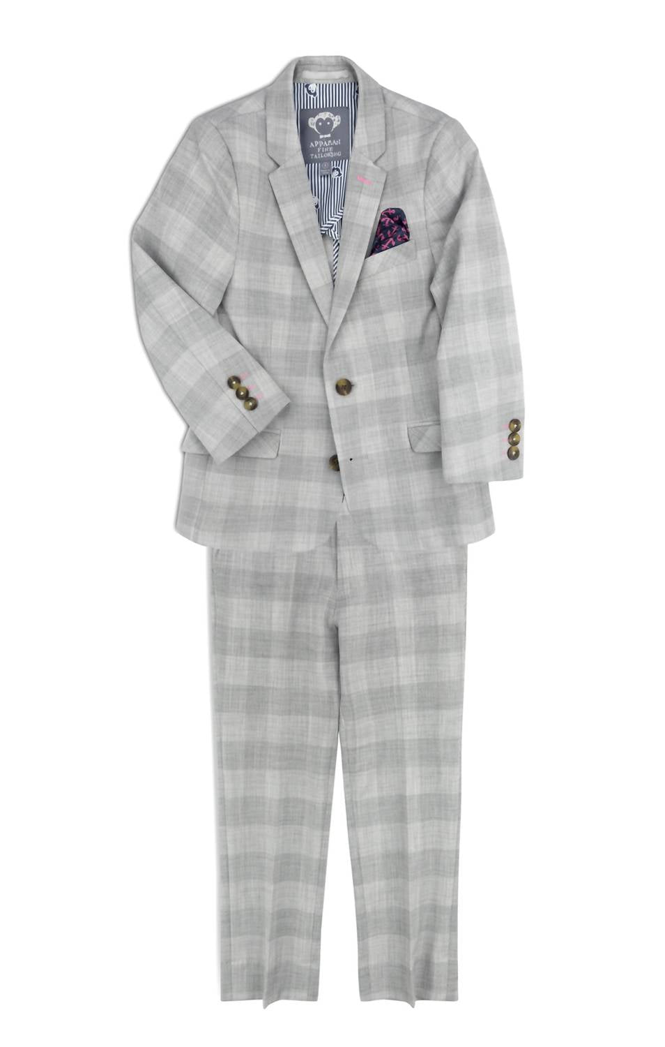 Elevate your young one's style with the Appaman 2pc Stretchy Mod Suit in a playful London Check plaid. This suit features full-length sleeves on the jacket, crafted from a blend of 67% Polyester, 29% Rayon, and 4% Spandex, with a lined interior for added comfort. The double button closure and slim fit pants, equipped with a notch tab button and hook & eye closure, offer a tailored look. Care is a breeze—simply machine wash warm with similar colors and tumble dry low.