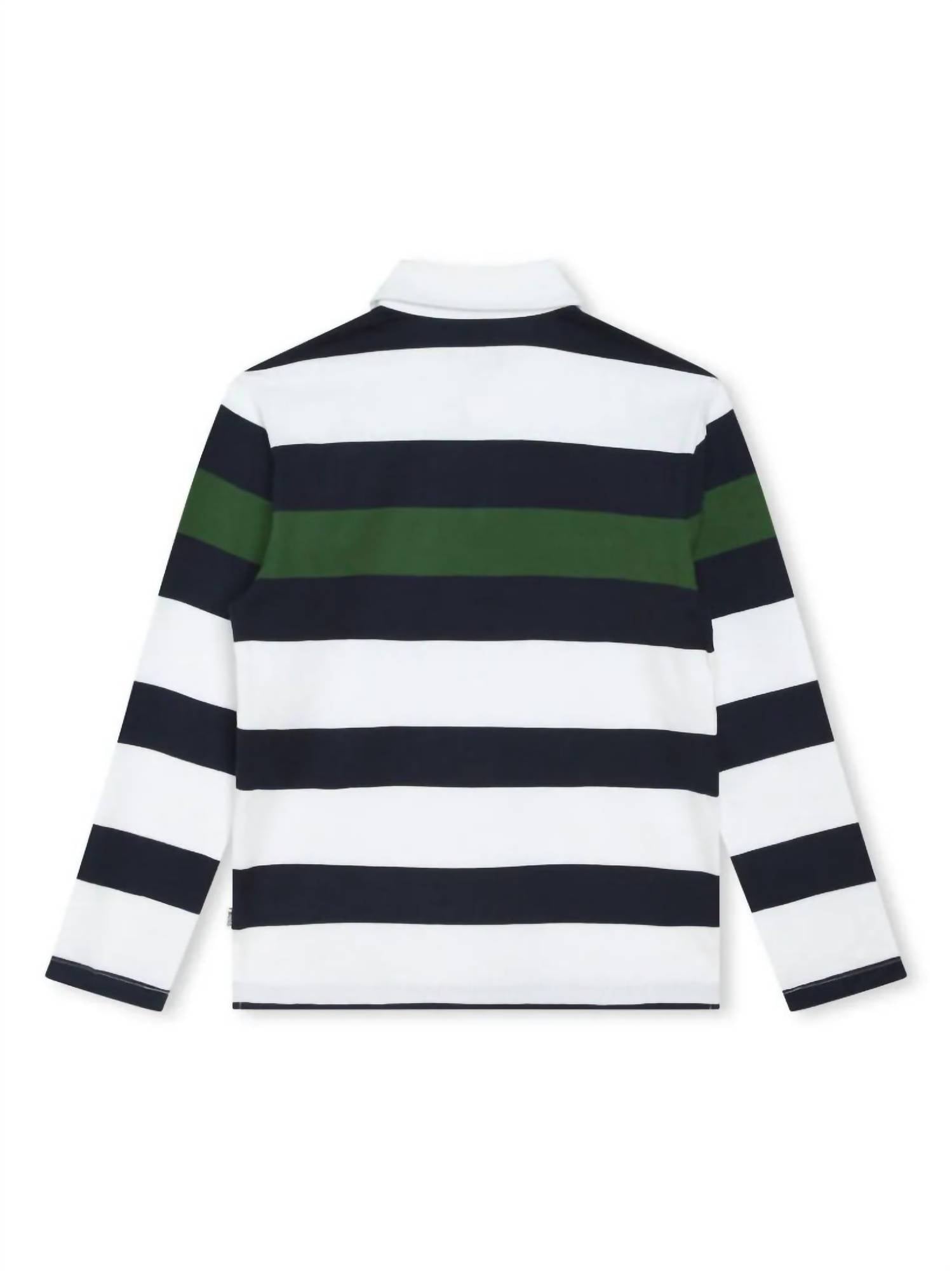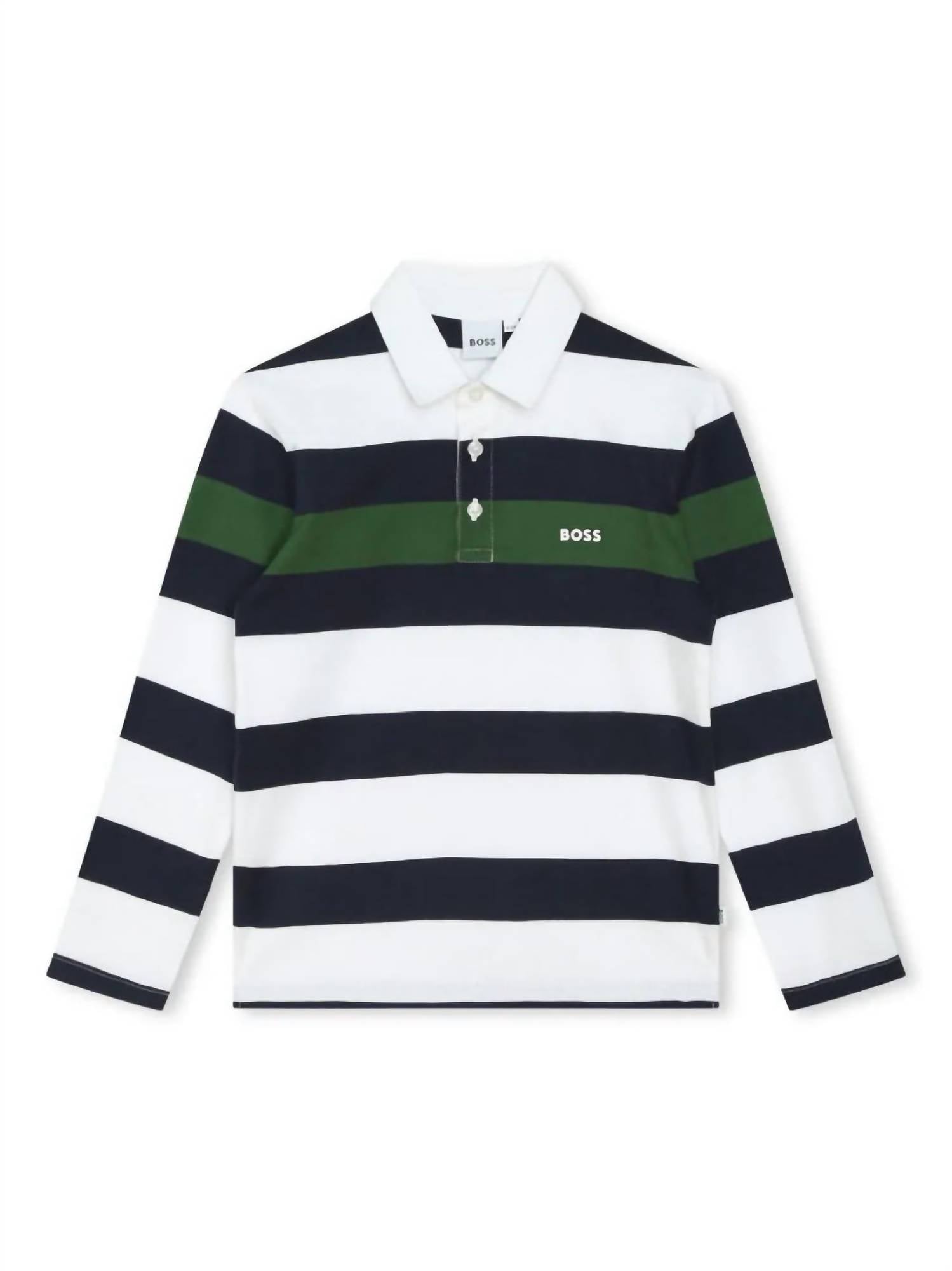 Esta blusa clássica de manga comprida apresenta um padrão listrado horizontal e uma gola estilo polo para um look casual e atemporal. Inclui uma carcela curta com botões na frente e uma discreta estampa do logotipo no peito, adicionando um toque de detalhe. Confeccionada em 100% algodão, oferece conforto macio e respirável, perfeito para o dia a dia.