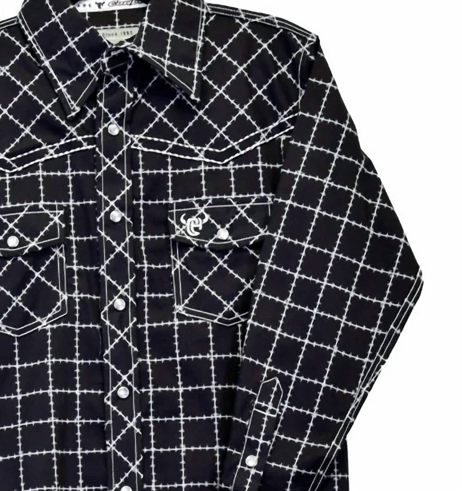 Apresentamos a Camisa Infantil com Estampa de Manga Longa e Barba por Fazer da Cowboy Hardware, perfeita para o cowboy iniciante. Esta camisa apresenta uma base preta marcante com um padrão xadrez de arame farpado branco, adicionando um toque de estilo western. Confeccionada em uma mistura de algodão, combina 97% algodão com 3% elastano para conforto e estilo. Fechamento: Fecho de pressão. Cuidados: Lavar à máquina.