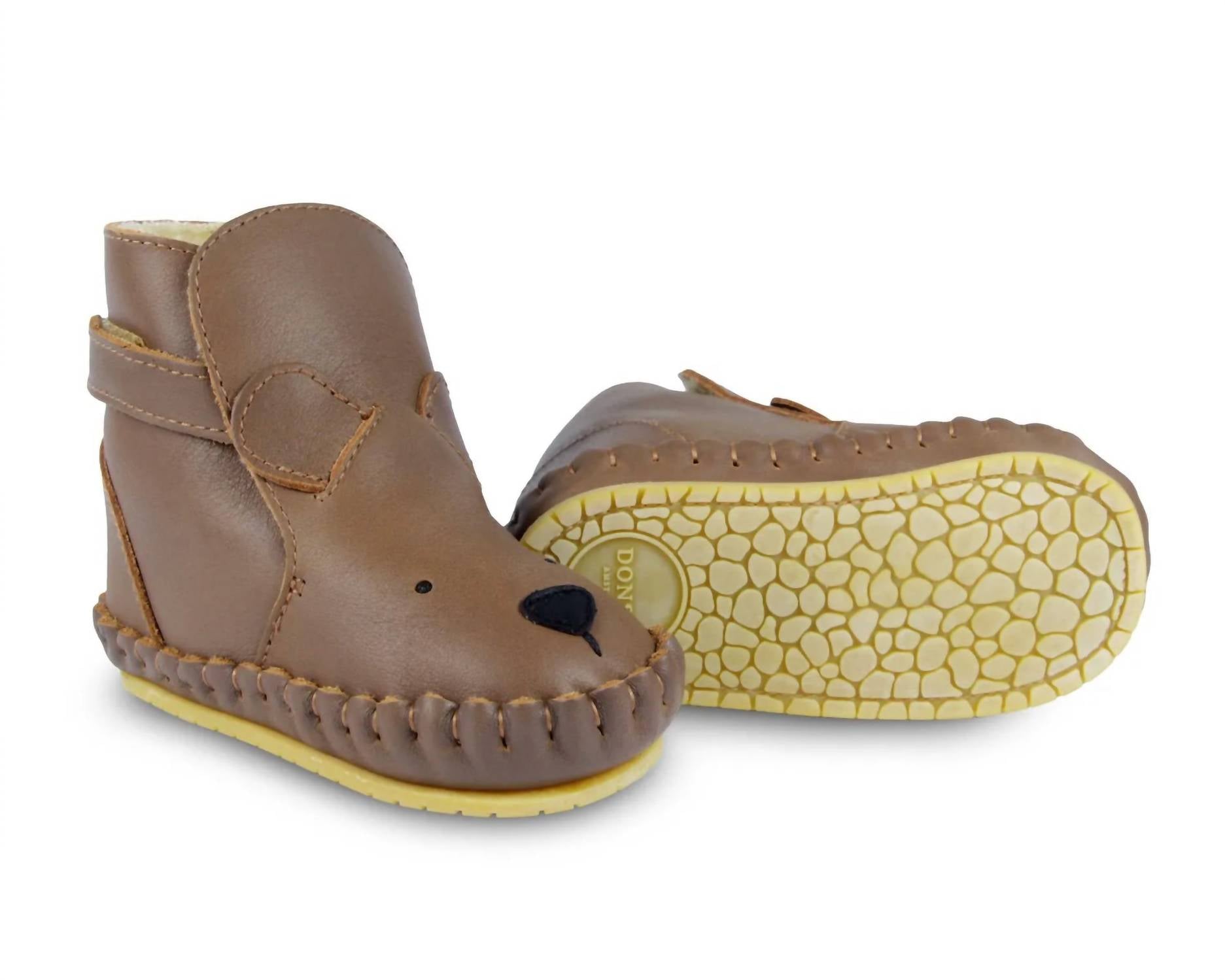 Introducing the Kid's Kapi Bear Classic Lining Bootie by Donsje, a charming choice in Cognac Classic Leather for baby's first steps. These boots feature a round toe and a flat heel design, handmade with 100% premium leather, lined with faux fur for warmth. The velcro fastening ensures easy wear, and the flexible soles vary by age group—anti-slip suede for sizes 0-6m, 6-12m, and flexible rubber for 12-18m, 18-24m. These well-crafted booties are fair-trade, embodying quality and comfort for your little one's first adventures.
