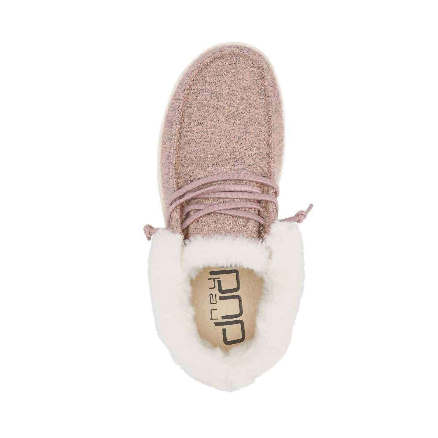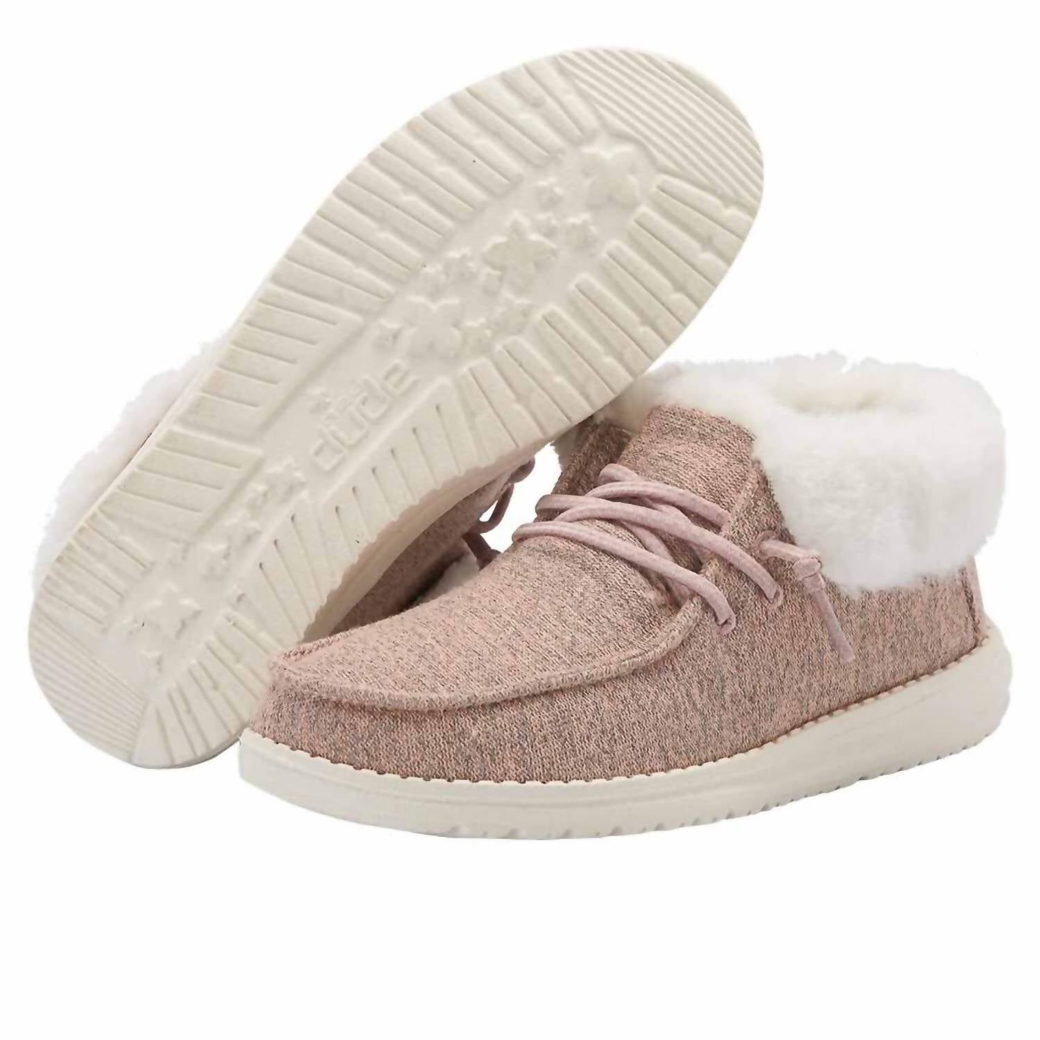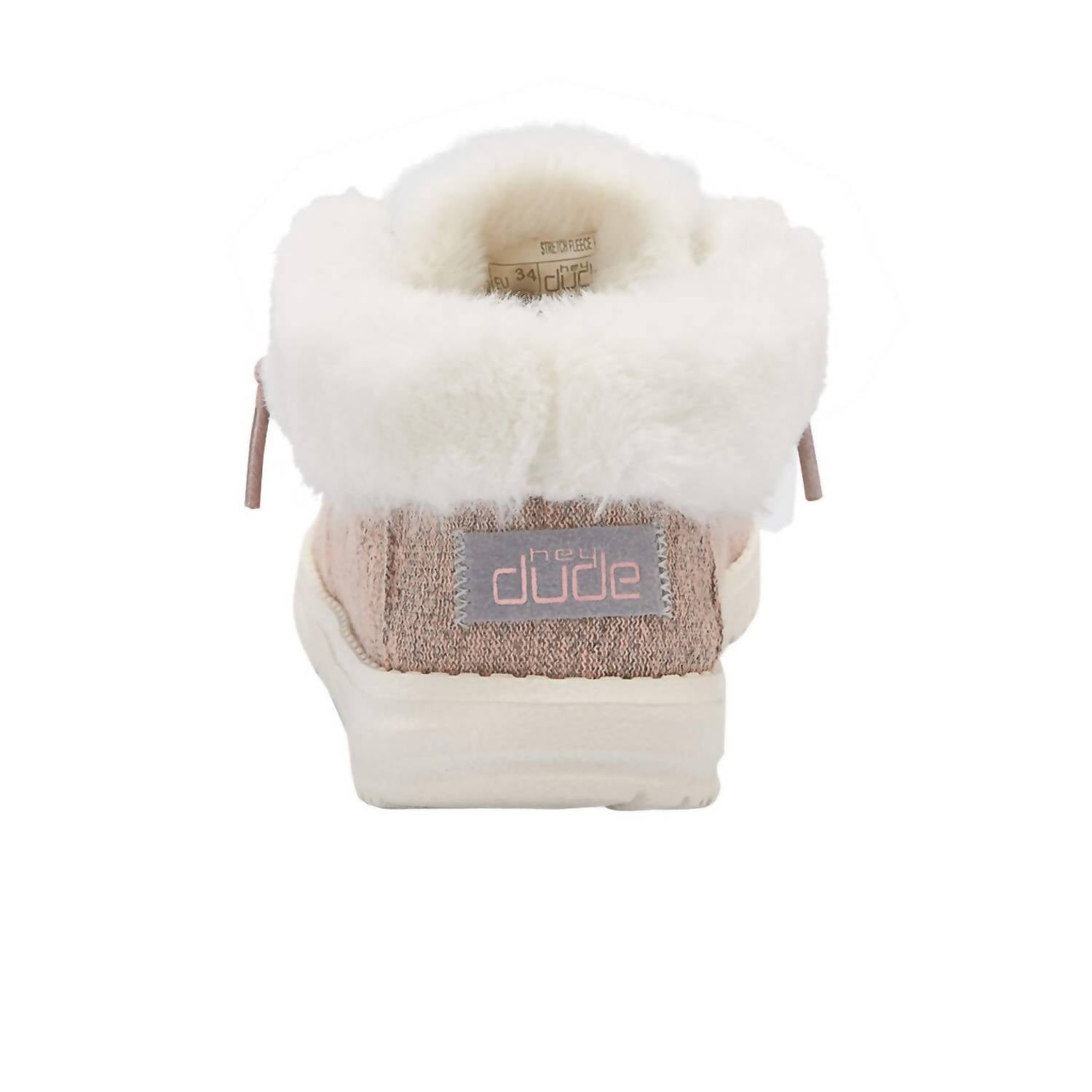 Apresentamos o Tênis Britt Stretch Fleece Juvenil da HEY DUDE, uma opção estilosa para viagens. Este tênis rosa apresenta um design tipo botinha com cabedal em lona e forro interno em pele sintética que se estende sobre o cano dobrável para maior aquecimento. O cadarço frontal proporciona um ajuste seguro, enquanto a tecnologia Flex & Fold garante conforto ultraleve. O calçado também inclui uma palmilha ergonômica, forrada em couro e removível com espuma viscoelástica para maior conforto. Projetado para adolescentes com bico redondo e salto baixo, este calçado combina funcionalidade com um visual clássico de bota de inverno.