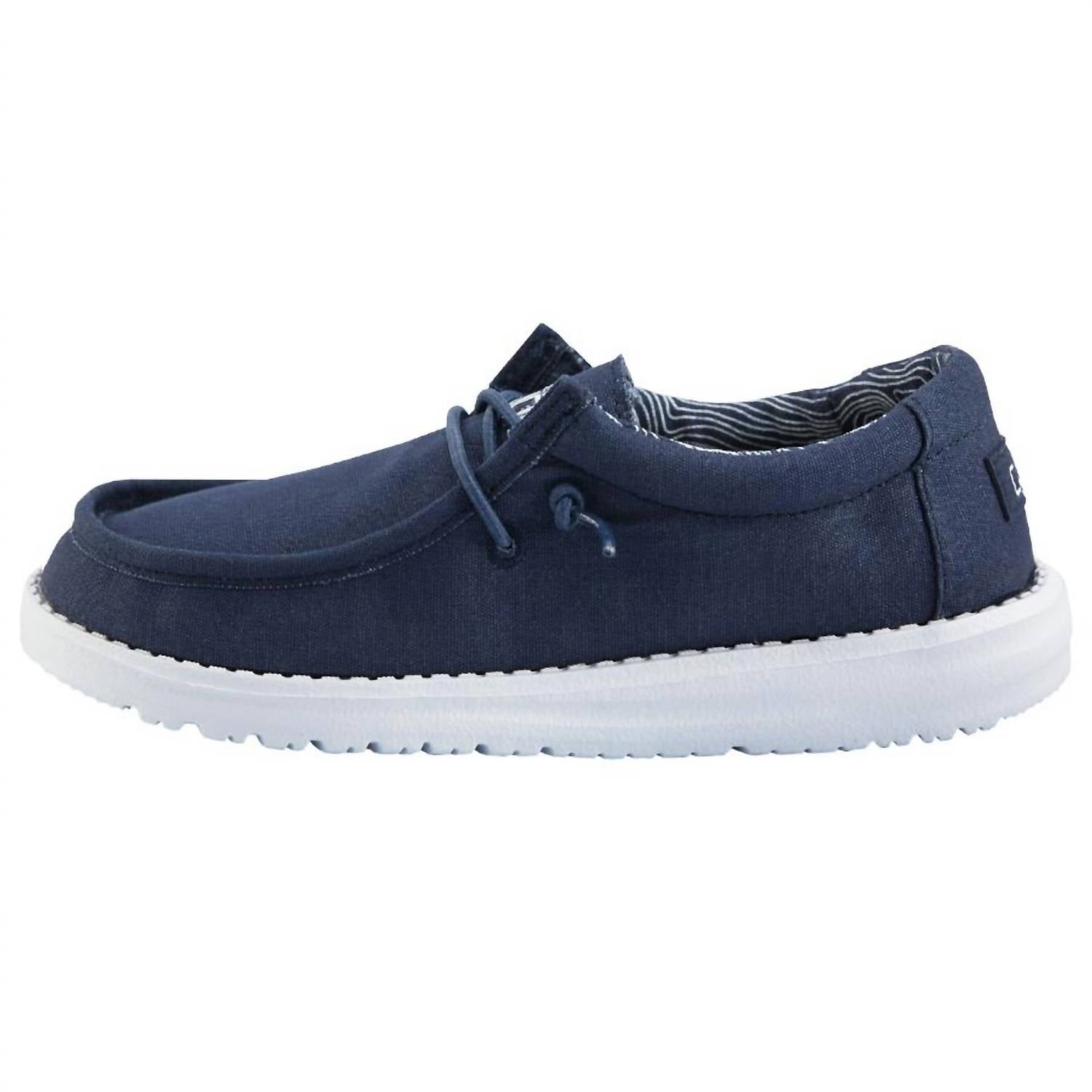Conheça o Tênis Casual Juvenil Wally da HEY DUDE, criado para todas as suas aventuras diárias com um cabedal macio de lona de algodão azul-marinho. Este tênis oferece bico arredondado e salto plano, garantindo conforto, enquanto o forro contrastante em mistura de algodão adiciona respirabilidade extra. Com um inovador sistema Easy-On e cadarços elásticos, este tênis slip-on de cano baixo garante diversão e funcionalidade. Com solado ultraleve e palmilha removível e forrada em couro, este tênis é fácil de lavar e secar ao ar livre para um cuidado sem complicações.