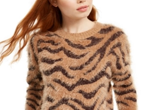 Listras de zebra divertidas cruzam o tricô macio dos cílios | trazendo uma vibe atual para este suéter aconchegante de manga comprida Hooked Up by IOT. | Gola redonda | Tricô dos cílios | Forma pequena | sugerimos um tamanho maior para um ajuste perfeito