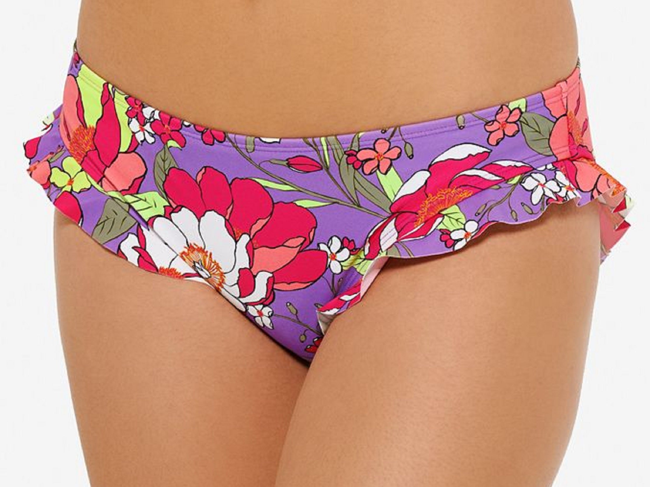Você vai adorar o acabamento com babados delicados da calcinha de biquíni Impressionist da Hula Honey. Combine-a com tankinis, tomara que caia e muito mais. | Ajusta-se nos quadris | Cobertura moderada da parte inferior; caimento curto | Babados nas pernas | Forrado |