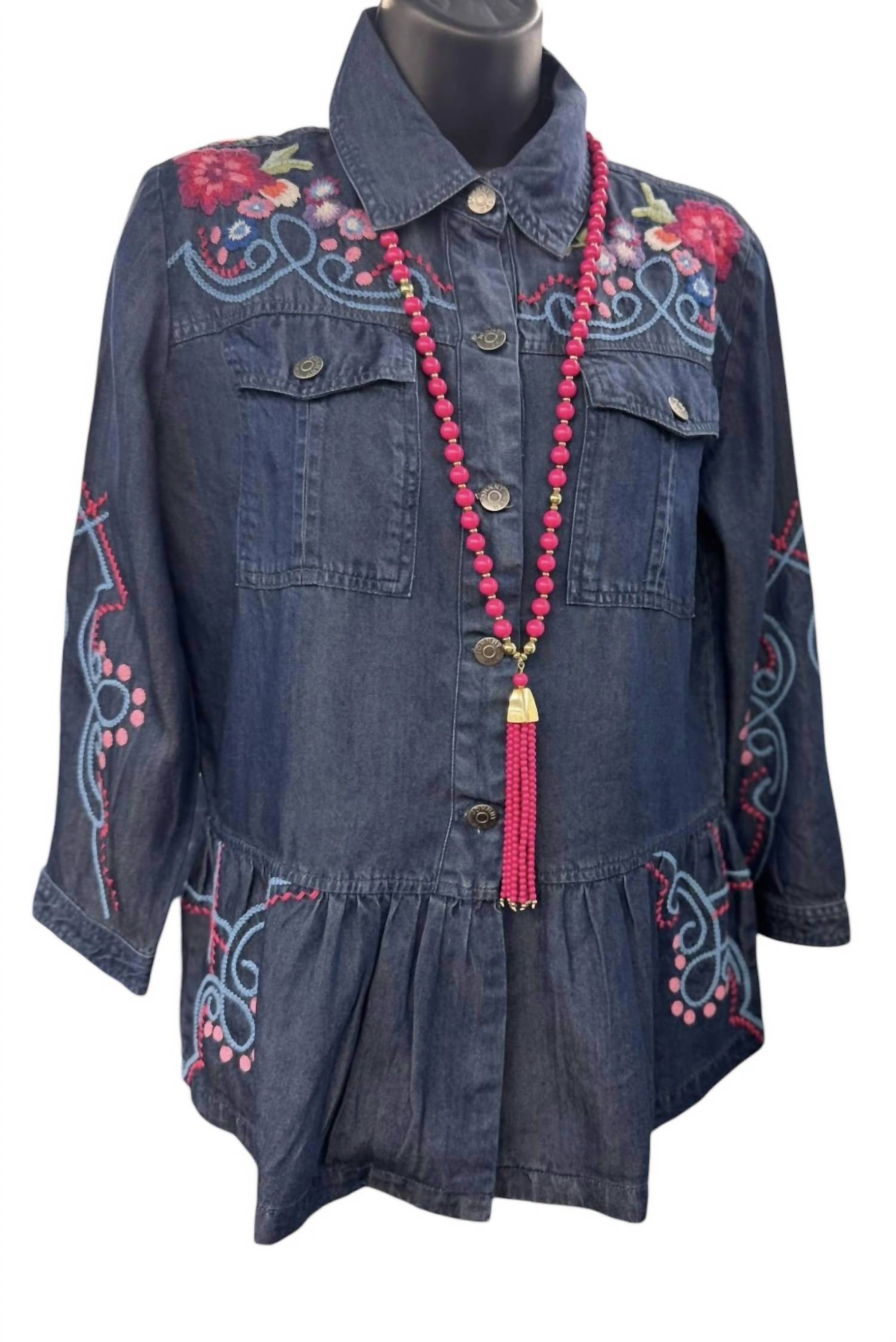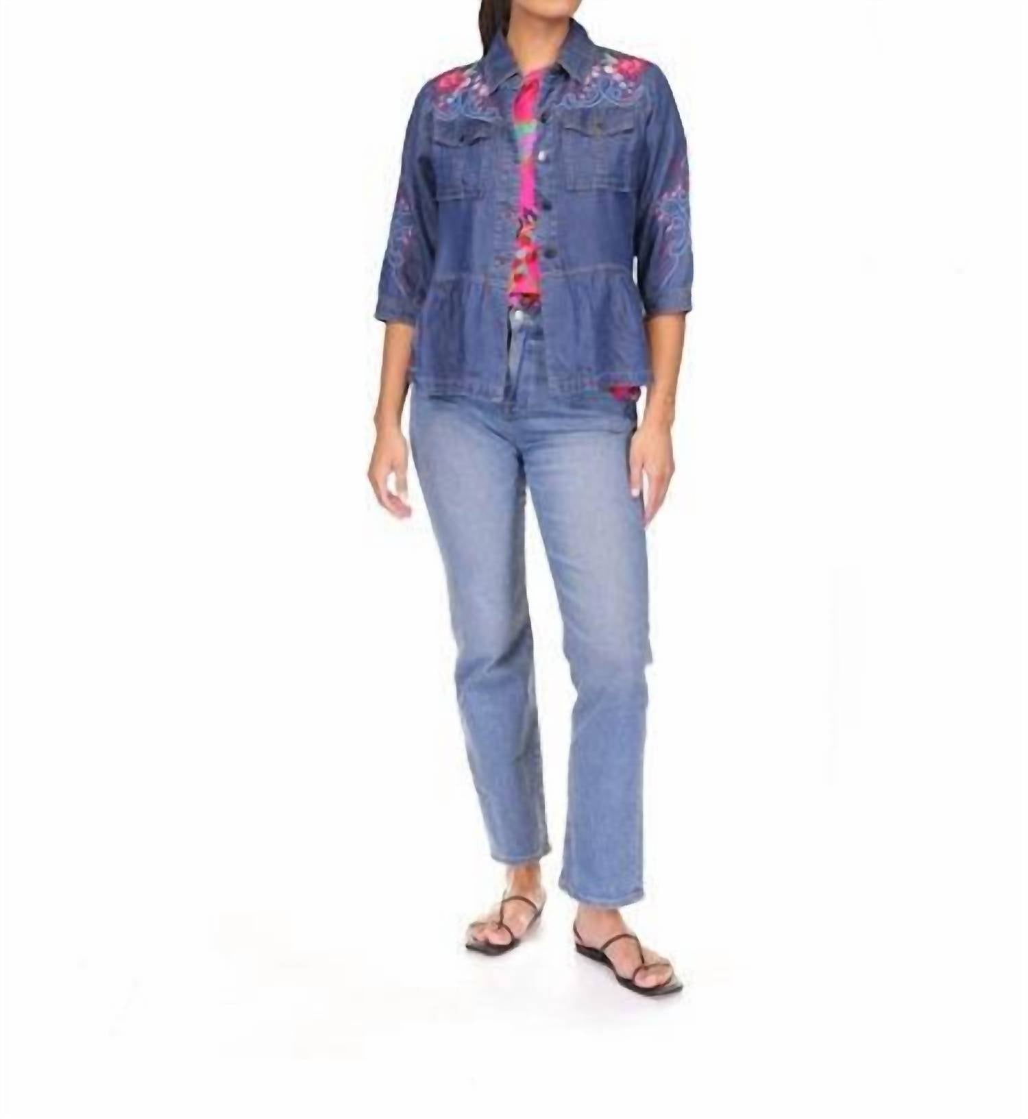 Eleve seu guarda-roupa com a Jaqueta Peplum Dita da Johnny Was, uma peça jeans texturizada em azul para uma declaração de moda ousada. Esta jaqueta jeans versátil exala um toque chique e ousado e é perfeita para diversas ocasiões com sua construção em jeans durável. Originária de um país não especificado, oferece fácil manutenção com instruções de lavagem à máquina. Ideal para mulheres que buscam uma adição estilosa e adaptável ao seu guarda-roupa.