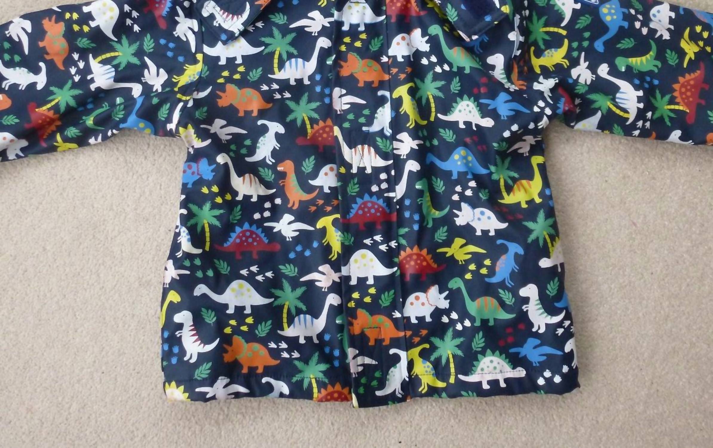 Introducing the Dinosaur Cozy Raincoat by Jojo Maman Bebe, a delightful blend of style and functionality for your little adventurer. Featuring long sleeves and a breathable bonded fabric, this coat keeps your child snug with its fleece lining and a cozy lined hood. Adorned with a playful dinosaur print that changes color when wet, it offers a fun touch while protecting against wind and rain. Closure: Zip closure with a popper storm flap. Care: Machine washable. Ideal for back-to-school spring outings.